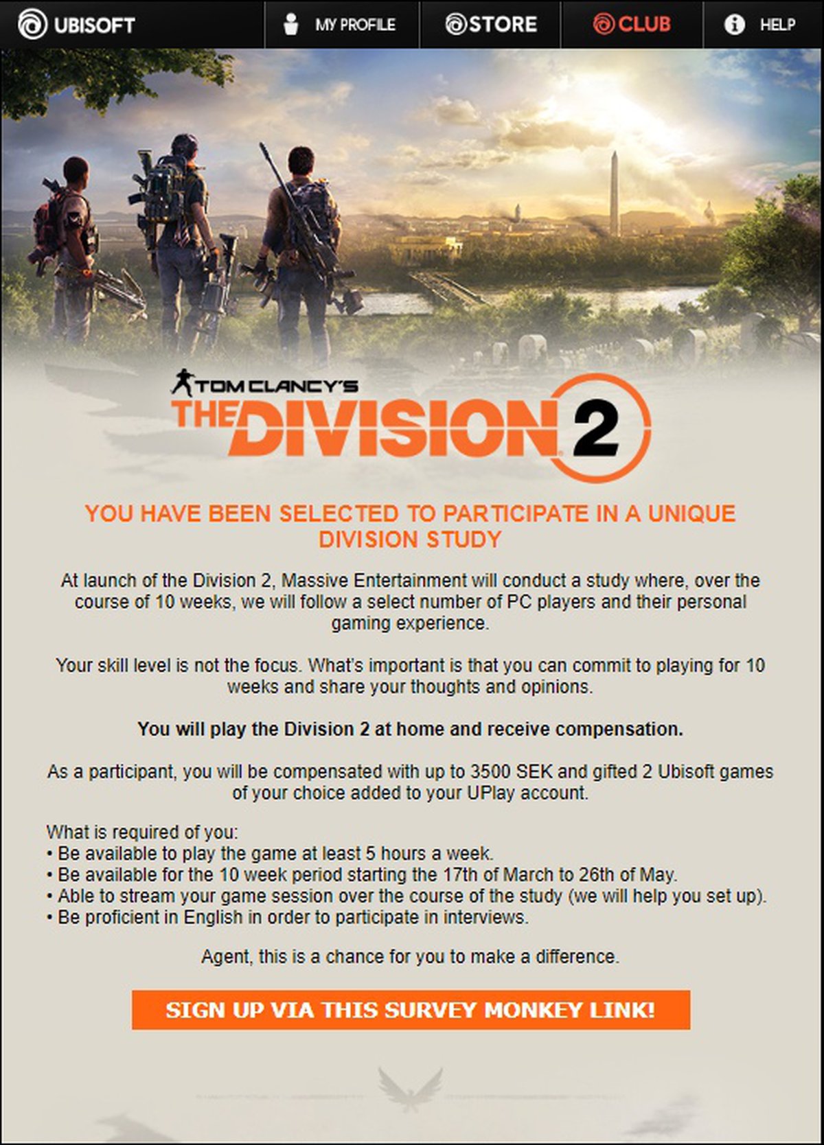 Как сказано в письме-приглашении, опубликованном одним из пользователей сабреддита The Division, уровень умений игрока не особенно важен. В первую очередь Ubisoft интересует хорошее знание английского языка и возможность играть в The Division 2 по меньше мере пять часов в неделю.