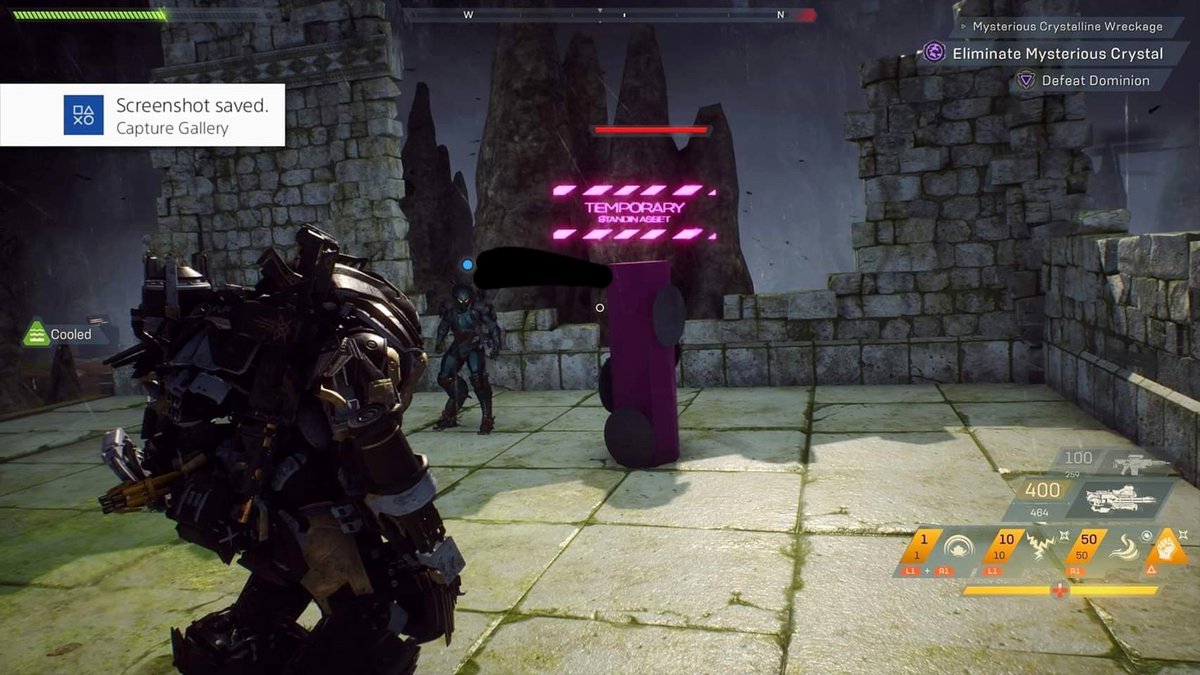 Лукас Вагнер, один из разработчиков Apple, обнаружил такой плейсхолдер в Anthem: Вагнеру попался фиолетовый «кристалл» с большой надписью TEMPORARY над ним. Кристалл не был спрятан где-то в открытом мире — он был целью задания, которое выполняла группа Лукаса.