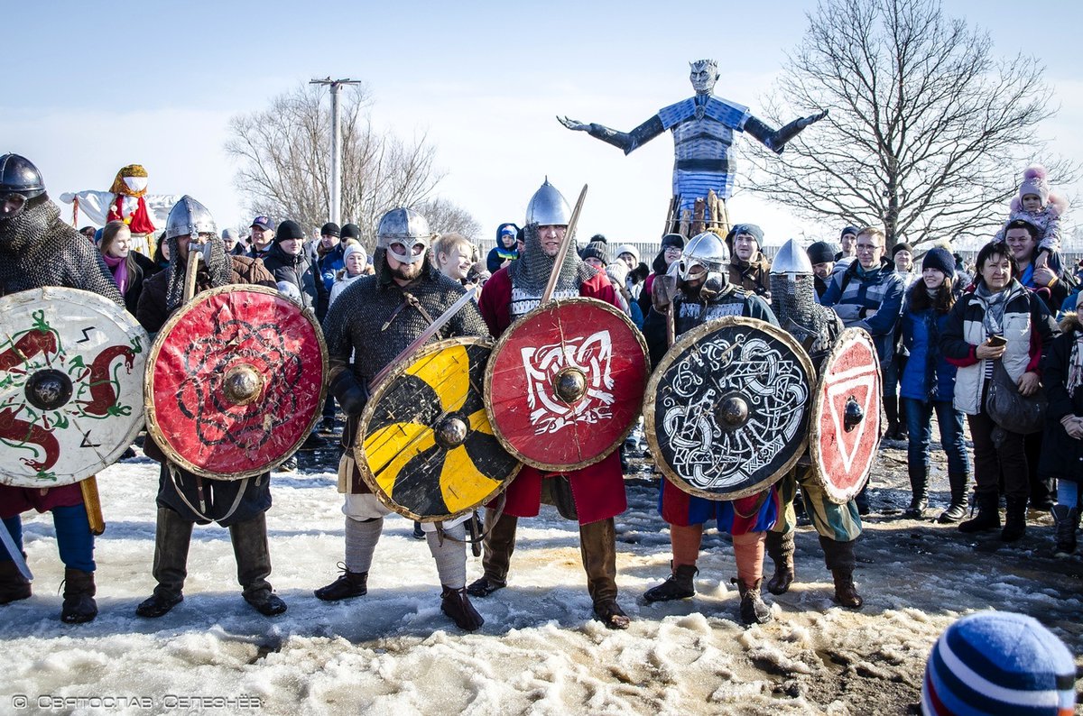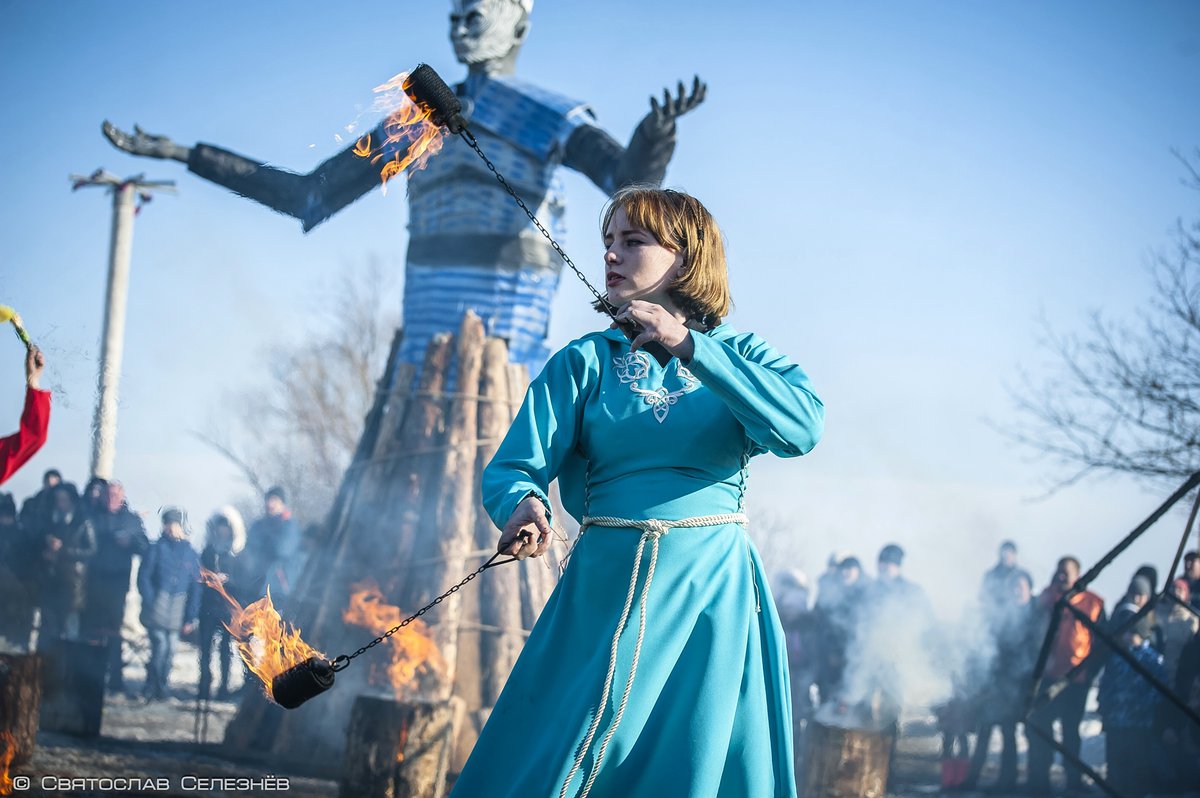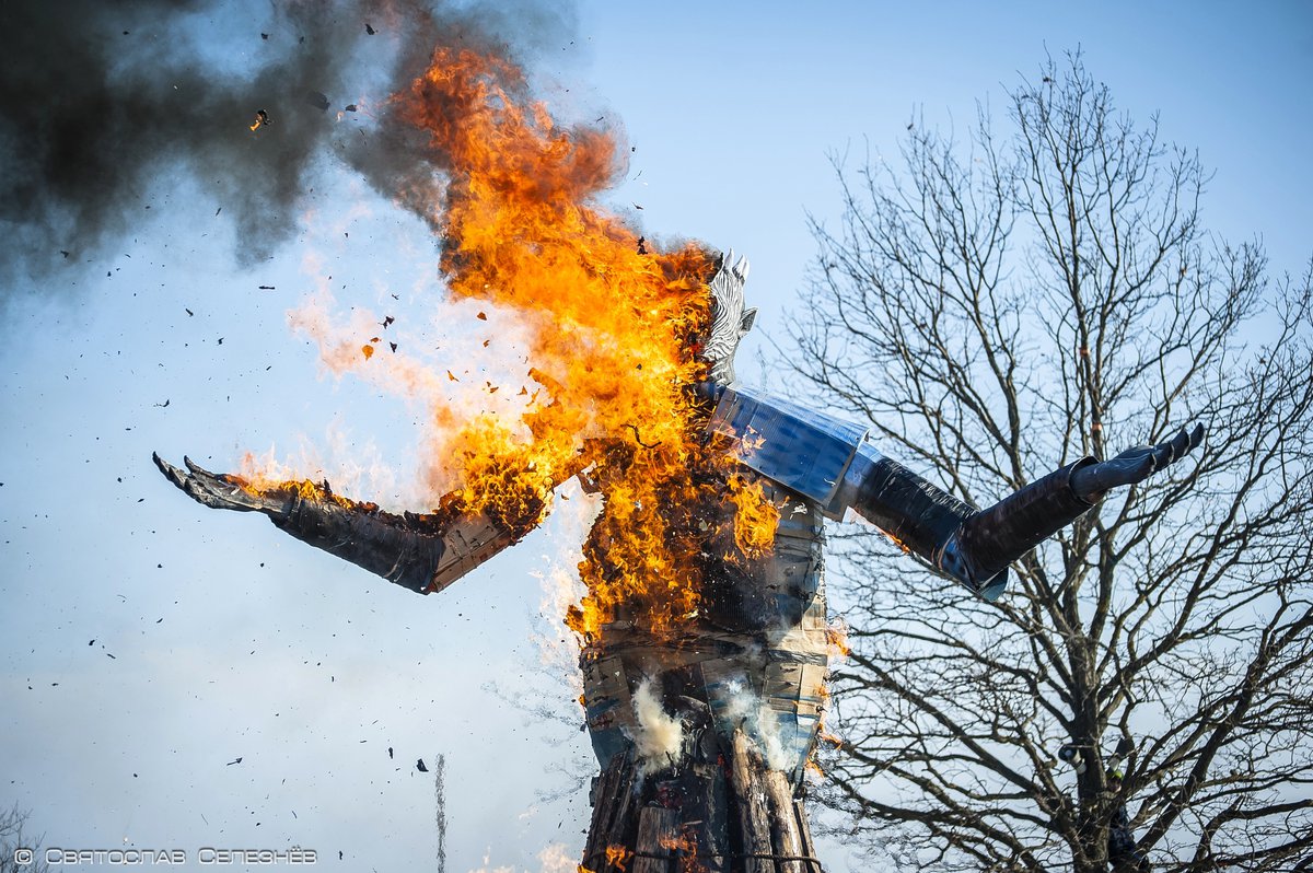 Вот еще несколько фотографий с Масленицы в парке Аргамач, сделанных Святославом Селезневым. Помимо горящего персонажа «Игры престолов» гостей парка развлекали сражениями реконструкторов, фаер-шоу и традиционными масленичными конкурсами.