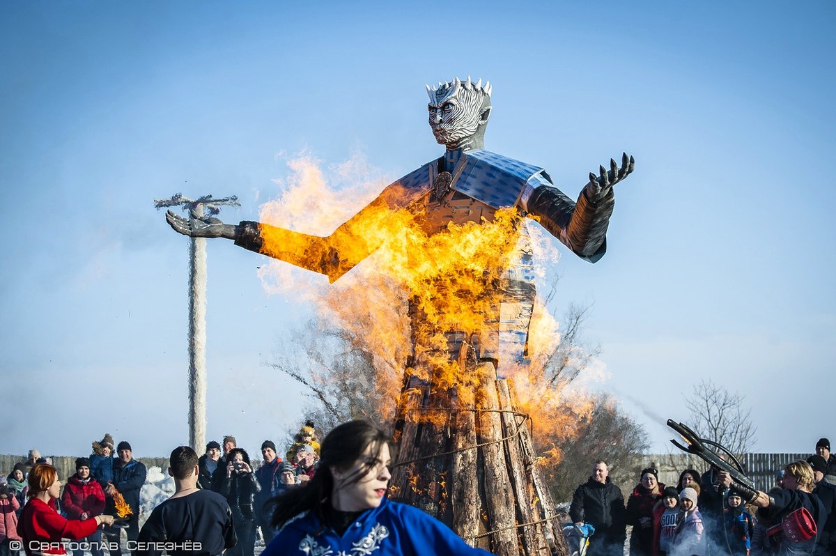 На минувших выходных в археологическом парке Аргамач, расположенном в Липецкой области, праздновали наступление Масленицы и начало весны. Одним из гвоздей праздника стало сожжение большой фигуры Короля Ночи из «Игры престолов».