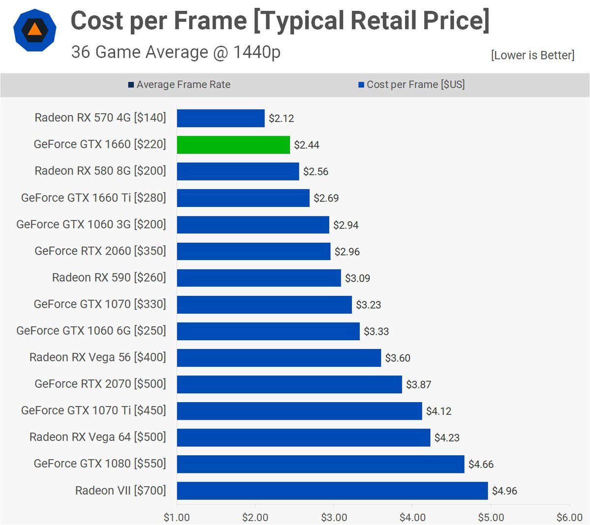 Согласно подсчетам TechSpot, по стоимости одного кадра в секунду GeForce GTX 1660 это одно из лучших предложений на рынке. В 36 протестированных играх один кадр стоил в среднем $2.44; для сравнения, владельцам GeForce GTX 1060 один кадр в секунду обойдется в $3.33, а у Radeon VII этот показатель достигает $4.96.