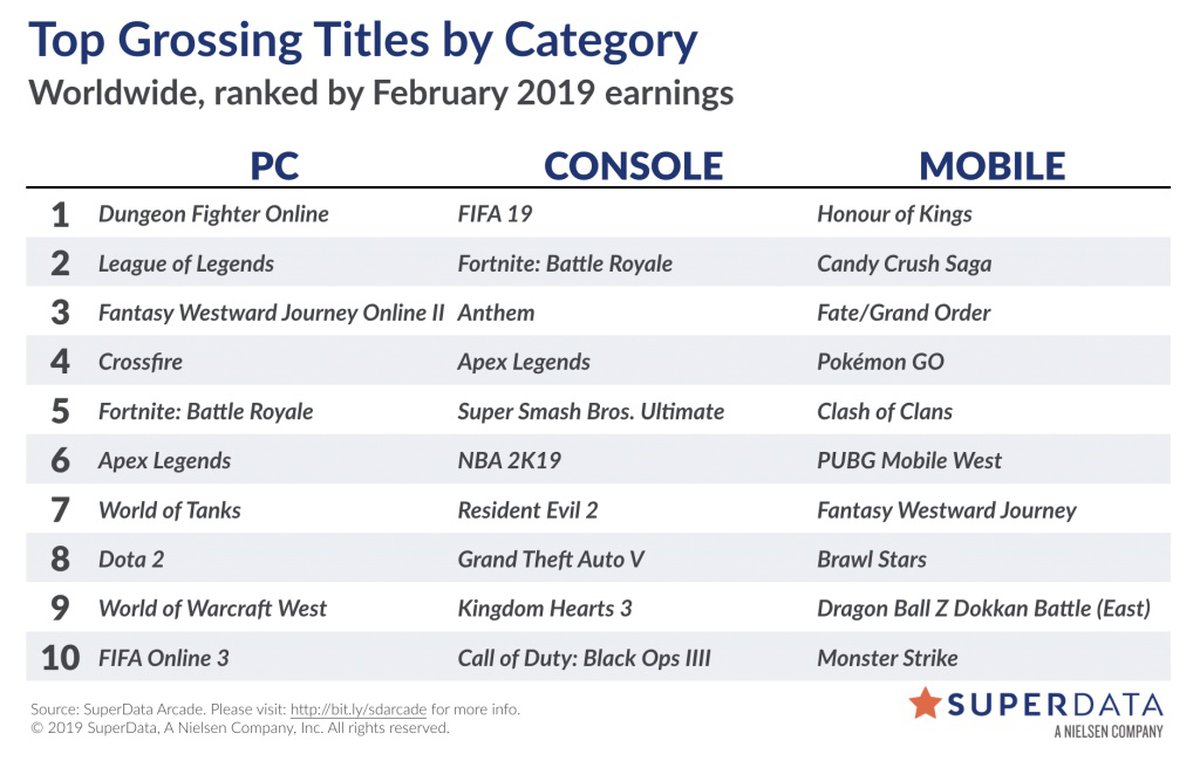 В целом объем цифрового рынка игр в феврале достиг $8.2 миллиардов. По сравнению с февралем 2018 года продажи увеличились всего на 2%; прирост обеспечили мобильные игры, проекты для PC и консолей показали падение выручки на 6%.