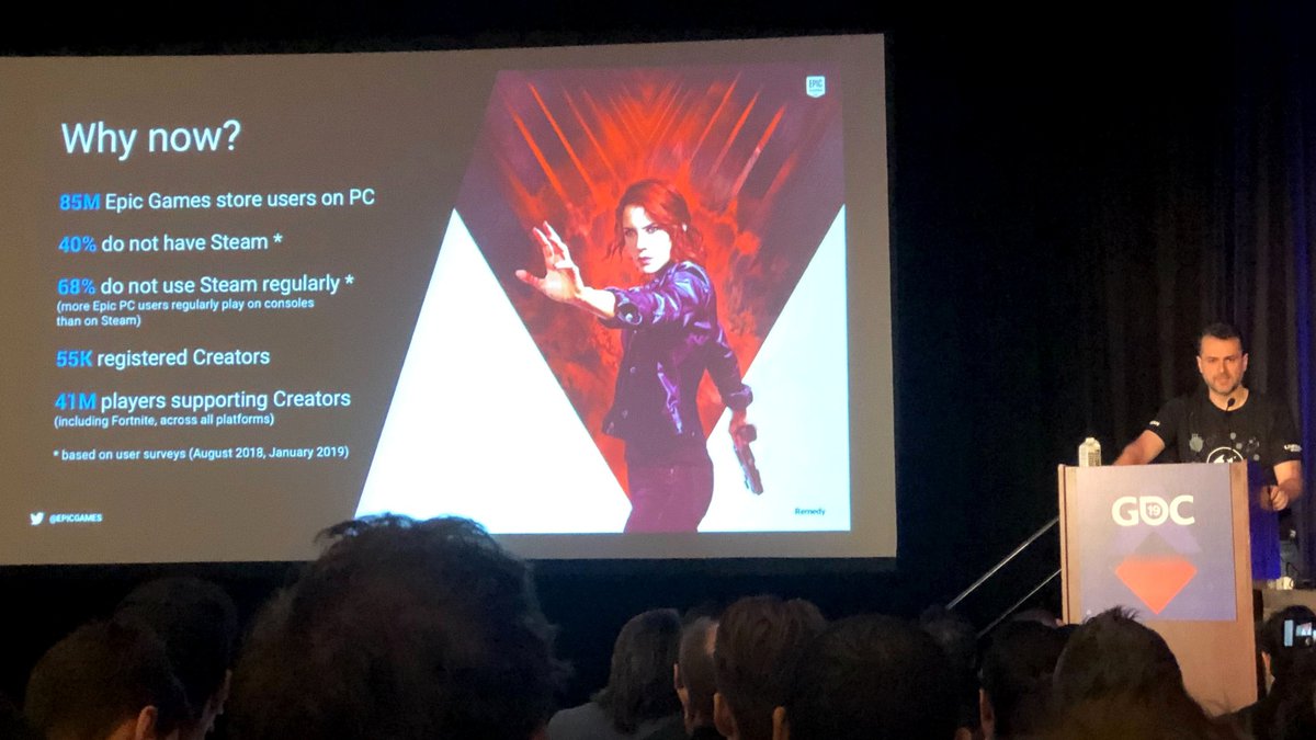 Редакция PC Gamer опубликовала фотографию с одним из слайдов, показанных во время презентации Epic Games Store на конференции GDC. Согласно опросам, проведенным Epic Games среди аудитории площадки, у 40% пользователей магазина нет Steam.