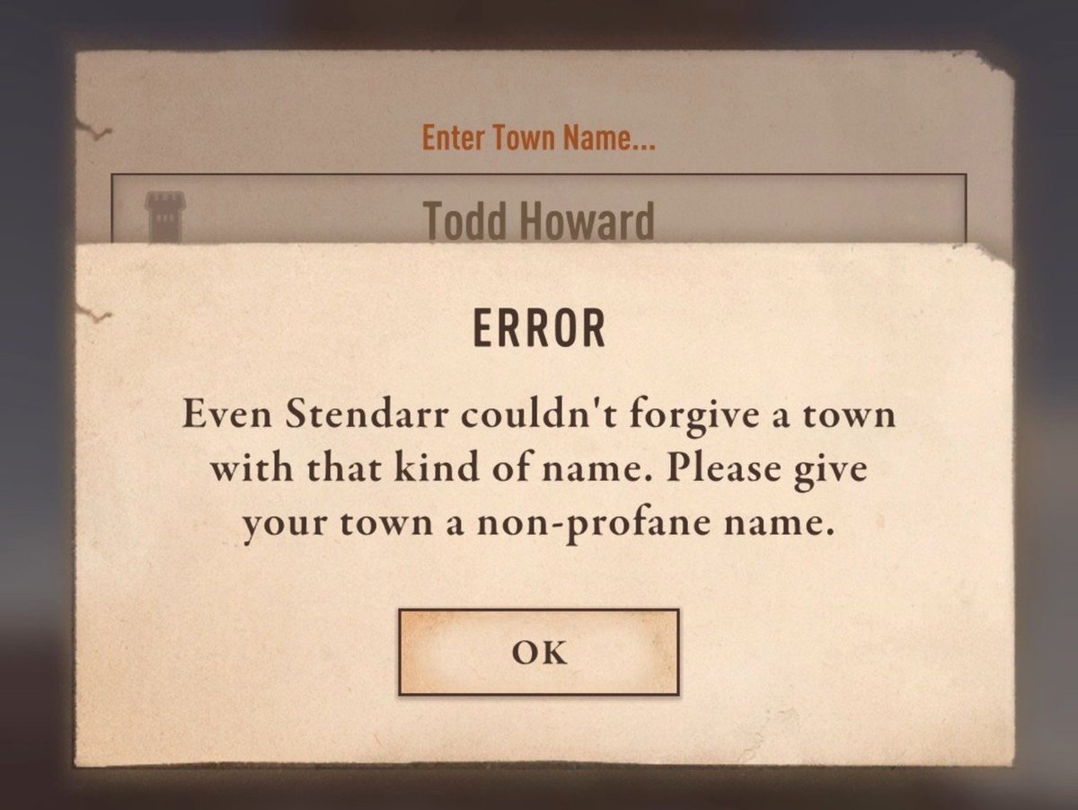 Другие ограничения более необычные. Один из игроков попытался назвать город в честь Тодда Ховарда, руководителя Bethesda Game Studios, и не смог. Как и в случае с нецензурным названием, игра сообщила, что даже Стендарр — бог милосердия в пантеоне TES — не сможет простить существование города с таким именем.