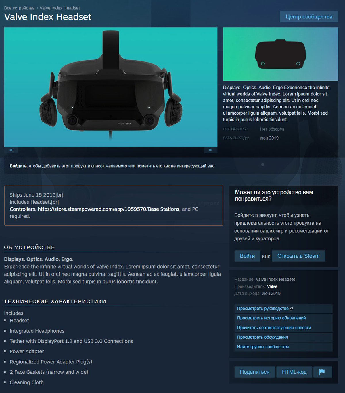 В Steam появилась страница VR-гарнитуры Valve Index и контроллеров Valve Index Controllers. Согласно информации, размещенной на странице, гарнитура поступит в продажу 15 июня 2019 года. Цены на странице Valve Index нет.
