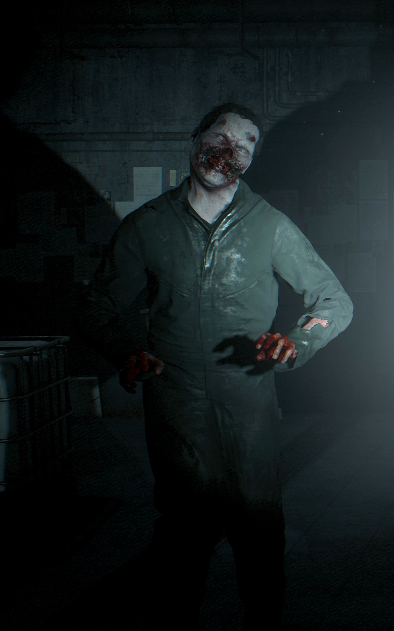 Я с интересом отнёсся к решению разработчиков сделать зомби более проблемыми врагами для игрока. Всё-таки, будем честны - в RE2-98 зомби были просто мелкими препятствиями на пути игрока и выпиливались без шуму и без пыли, и эта странность неизбежно порождало дыру в лоре - если Лёня и Клара в одно жало запросто зачищают от зомби (и других, пострашнее) целый участок и прилегающие земли, то что ж полиция и спецы, вооруженные гораздо серьезнее, не могли справится с этими слабаками? Здесь они очень сильно напрягают при первом прохождении, да и в целом их нельзя недооценивать. Это настоящие мастера по мелким пакостям и подлым нападениям. Эти гады обожают притворяться дохлыми и внезапно кусать героя за ласты, и если их башка цела, то нет 100% гарантии, что после одного-двух успокоений эта гнида не оживет попозже. Они бесят и нервируют, и это в плюс. Минус - они все ведут себя абсолютно одинаково и потому предсказуемы. Да и в больших количествах они не представляют большей угрозы, чем порознь - в RE2-98 толпа могла очень быстро захавать игрока, так как анимация укуса была короче, а отталкивание одного врага вовсе не означало, что остальные будут вежливо стоять в течении пары секунд, дожидаясь, пока игрок исполнит себастьяна (опять-таки вежливые враги). Здесь же при укусе игроку дается фора в виде секунды-двух, это не учитывая оружия ближнего боя, которое еще и от урона избавит. В итоге я за Ханка пробегал здоровую толпу зомбаков вообще безо всякого урона. Однако, враги они подходящие, свою роль выполняют. Если увлечься бездумной стрельбой по ним, то быстро останешься без патронов. А вот вариаций зомбаков крайне мало, чаще всего встречаются: