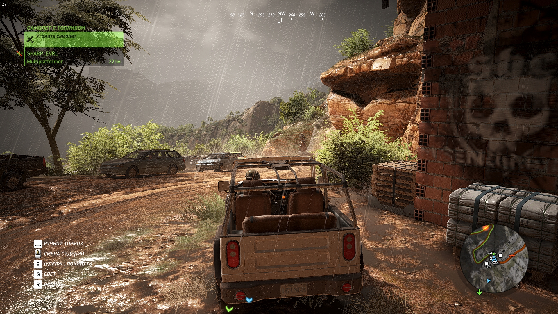 С первых секунд в игре ты видишь всё, что тебя окружает и ты, не побоюсь этого слова, в восторге, причём таком, что дух захватывает. Просто великолепная картина, окружающий вас мир, который ты чувствуешь. Ты восхищаешься тем, как всё проработано. Шикарная вода с отражениями, вся зелень, что имеется на карте, физична и реагирует на персонажа, заборы и каменные ограждения не являются препятствием для вашего транспорта, ведь они разрушаемы. Очень круто, честно. Играя даже не на ультра настройках, графика одна из лучших, что я видел. Сразу понимаешь, что над игрой старались. Здесь полностью динамичная погода, которая радует глаз. Это может быть солнечный день или пасмурный, а может пойти лёгкий дождь или сильный ливень с грозой. На счёт последнего — смотрится лучше всего, и лучше, чем в какой-либо другой игре. Погода меняется, меняется ветер, отчего капельки дождя меняют траекторию, и наблюдая это, в сочетании с сильным прогибом травы и деревьев, ощущаешь, что тебя вот-вот сдует. При этом полноту картины даёт ваша одежда, которая так же реагирует на ветер. Изумительно.