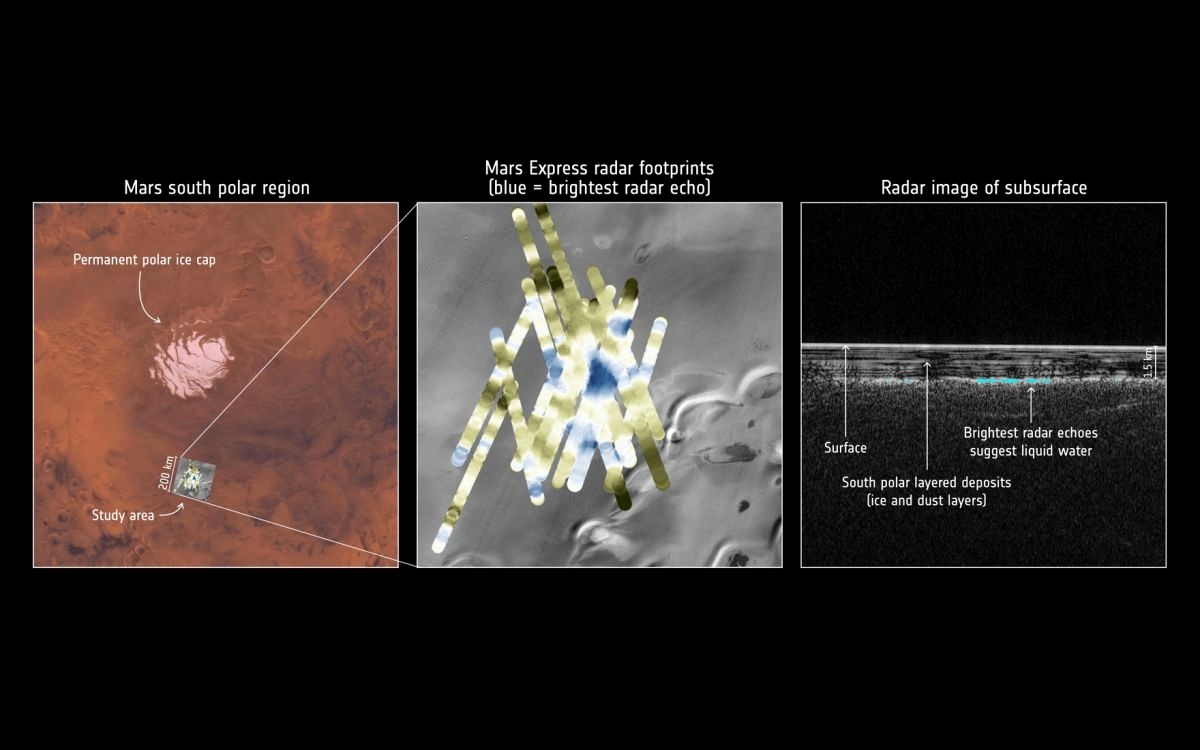 Однако летом 2018 года поступила сенсационная новость об обнаружении жидкой воды на Марсе. Спутник Mars Express изучал Плато Австралии вблизи южной полярной шапки и результаты его исследований позволили ученым утверждать, что подо льдом на глубине примерно 1,5 км находится резервуар с жидкой водой шириной порядка 20 км. А учитывая его защищенность толстым слоем льда от космической радиации, можно также предположить и наличие жизни в воде.