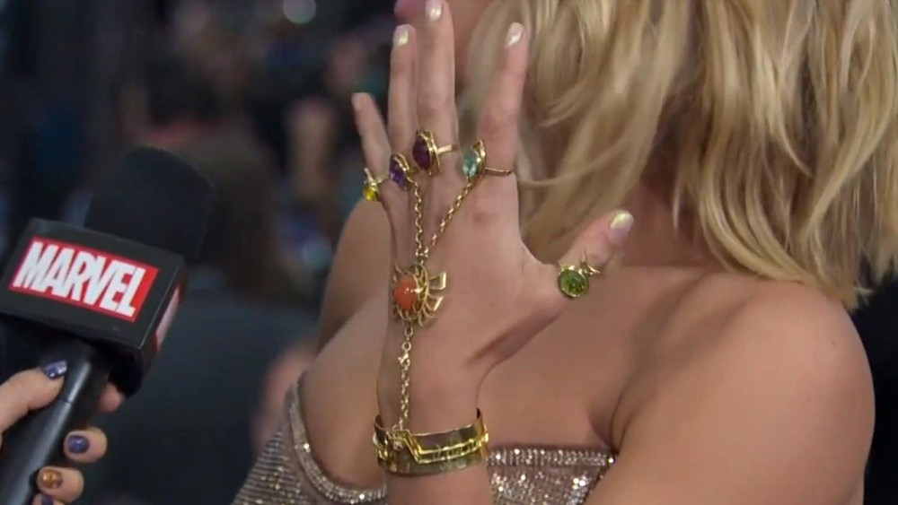 Бри Ларсон (Капитан Марвел) и Скарлетт Йоханссон (Черная Вдова) выбрали очень похожие аксессуары, напоминающие Перчатку Бесконечности. Еще одним актером, чей образ отсылает к киновселенной, стал Вин Дизель, озвучивавший Грута. Он пришел на премьеру в куртке, декорированной в стиле своего персонажа.