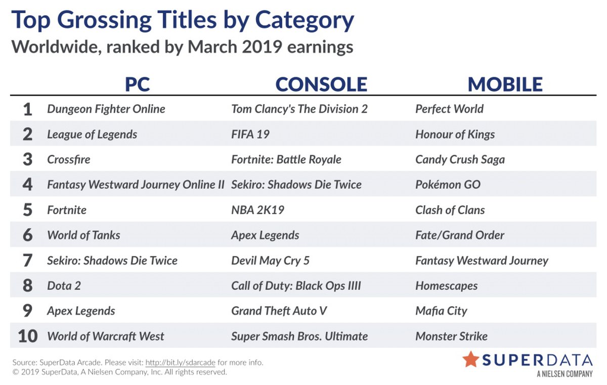 По оценке SuperData Research, в марте 2019 года объем цифрового рынка игр достиг $8.7 миллиардов — на 3% меньше, чем годом ранее. Продажи игр для PC упали на 23%, выручка консольных игр выросла на 10% во многом благодаря Fortnite и Apex Legends.