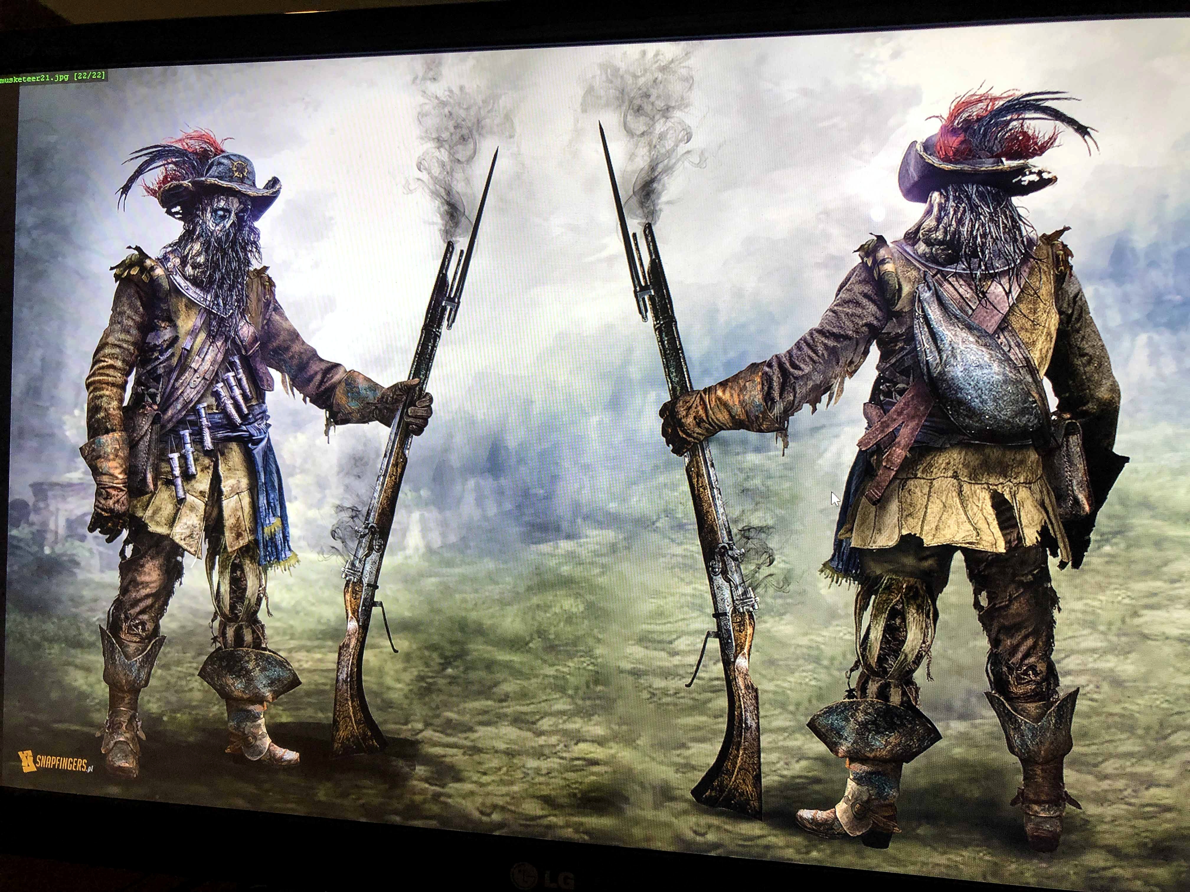 Концепт-арт немертвого мушкетера, одного из противников, с которым встретится главный герой Witchfire. Следующий кадр это тот же мушкетер, но уже в виде актуальной внутриигровой модели. Она еще будет дорабатываться.