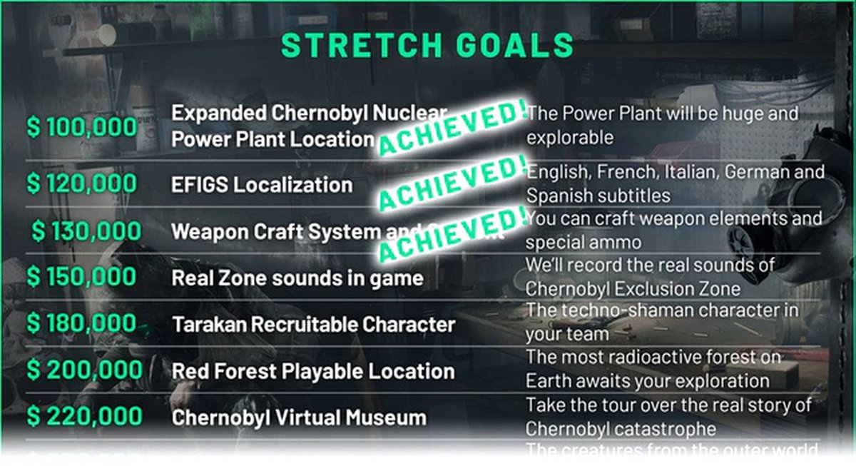 Пока на расширение возможностей и механик Chernobylite собрано чуть больше $143 тысяч. Разработчикам удалось выполнить три цели кампании: базовую, предполагающую ввод в Chernobylite АЭС, которую можно исследовать, локализацию на пять языков и расширенную систему крафта патронов и деталей оружия.