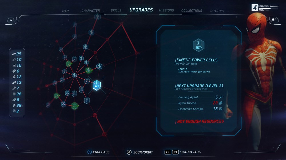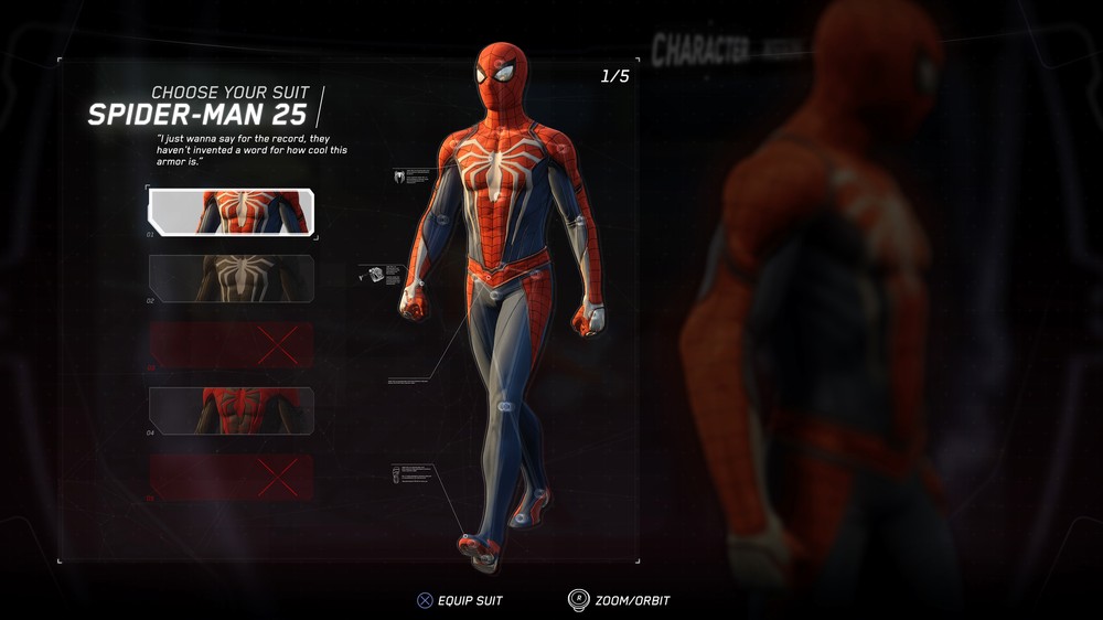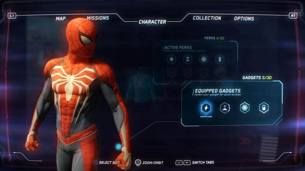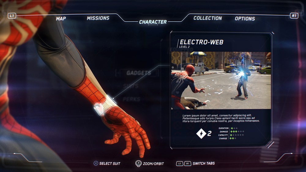 Вариант, показанный Жауме, выглядит футуристичнее и тяжелее того интерфейса, что попал в финальную версию Spider-Man. Сильнее всего изменилось древо умений, ставшее не таким сложным, и интерфейсы, связанные с костюмами и гаджетами.