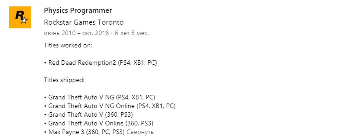 В резюме разработчика упоминаются версии Red Dead Redemption 2 для всех трех платформ: PC, PlayStation 4 и Xbox One. Интересно, что Нан Ма покинул компанию езе в октябре 2016 года; если данные верны, то разработка порта велась еще тогда.