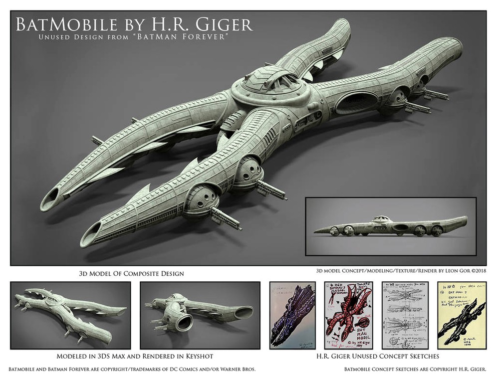 В дизайне машины Бэтмена, нарисованной Гигером, прослеживается некоторое сходство с фирменной некро-готикой «Чужого». На некоторых набросках автомобиль напоминает живое существо; возможно, благодаря красному, а не черному цвету.