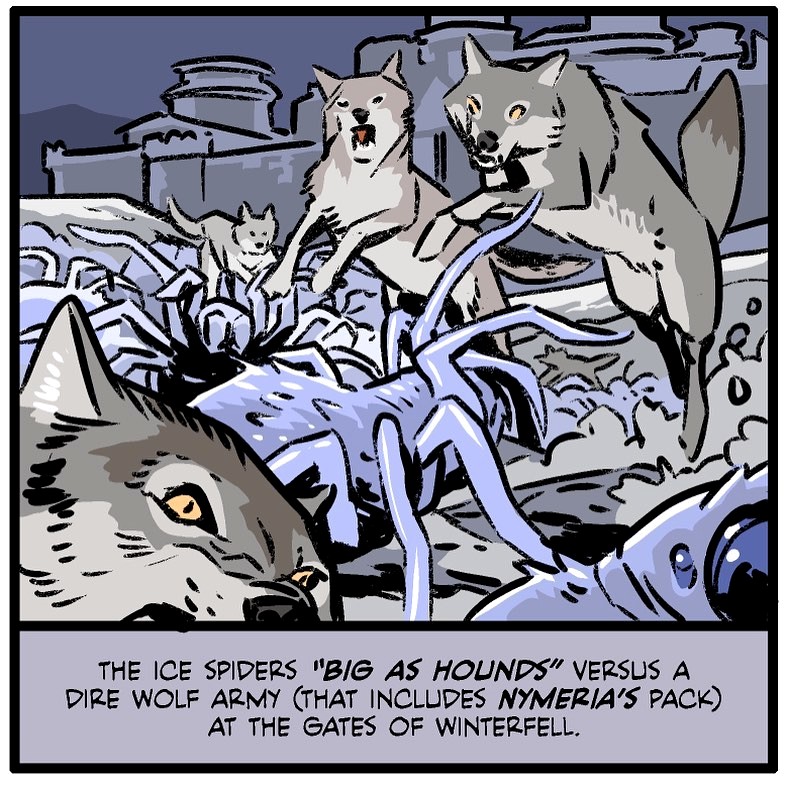 В битве за Винтерфелл на стороне Короля Ночи сражаются ледяные пауки. Им противостоит армия волков, в том числе стая Нимерии, лютоволчицы Арьи Старк.