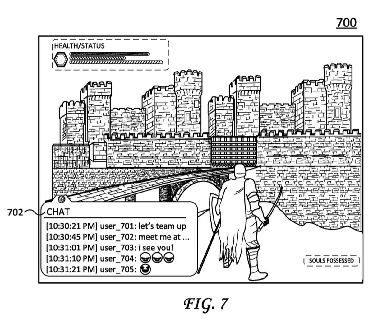 Как сказано в заявке, на основе полученного изображения и распознанной эмоции консоль может предложить отправить соответствующее emoji друзьям игрока, находящимся в сети. На пояснительном рисунке изображена игра, напоминающая Dark Souls, и чат-оверлей.