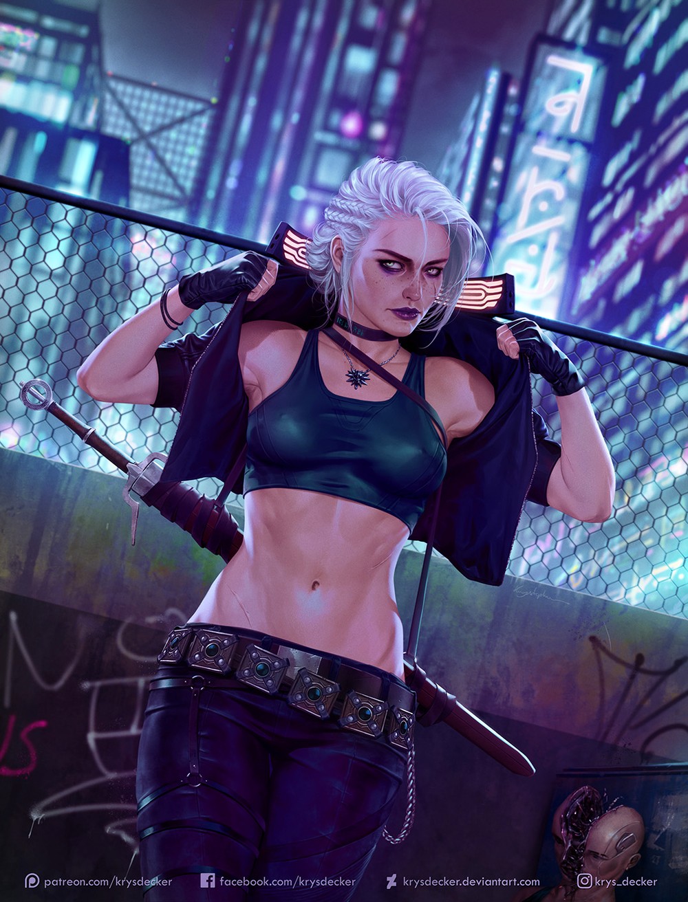 Последней работой Криса стала киберпанк-версия Цири. Художник постарался оставить неизменным образ героини The Witcher 3 Wild Hunt — Цири выглядит так, словно только что прибыла в новый мир, раздела первого встречного жителя Найт-Сити и готовится отправиться навстречу приключениям.