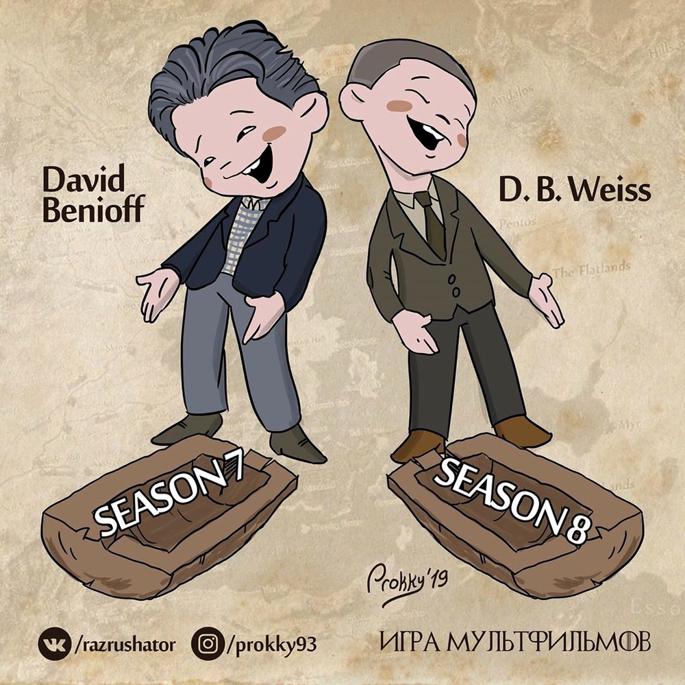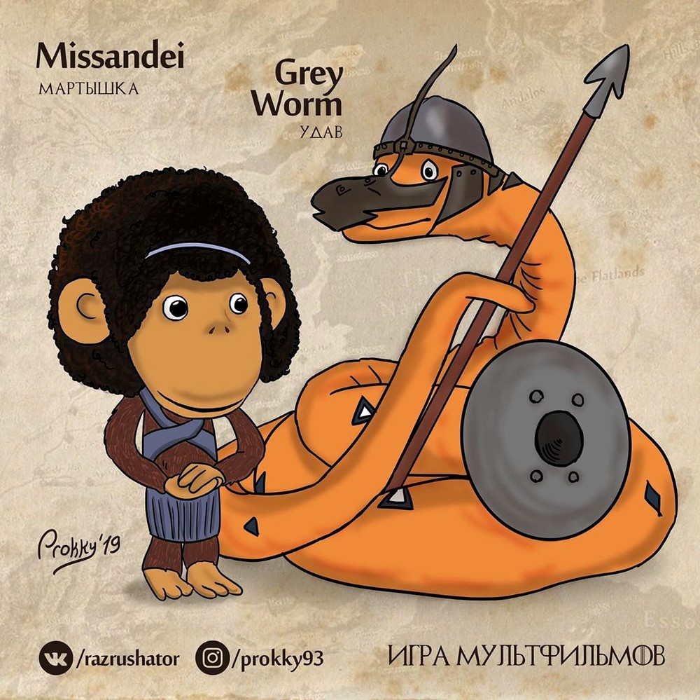 Отличными находками стали Миссандея и Серый Червь — в мультяшной «Игре престолов» ими стали Мартышка с Удавом — и образы Дэвида Бениоффа с Дэном Уайссом, под которых замаскировался герой «Вовки в Тридевятом царстве».