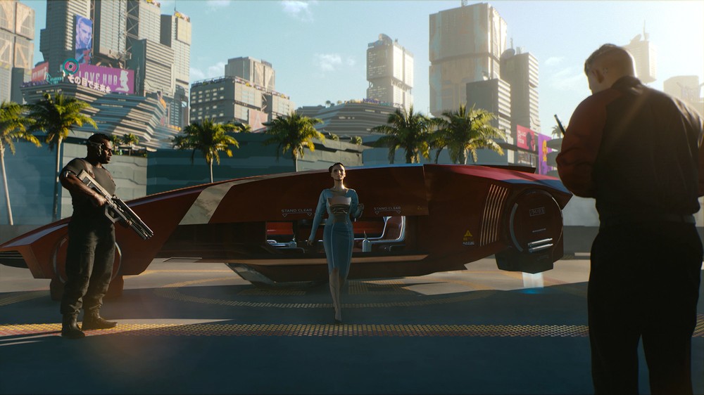 Обратите внимание: скриншот сделан в одно и то же время суток (даже облака на месте), но освещение изменилось: теперь машина Ви выглядит реалистичнее, у нее горят стоп-сигналы. Цветовая палитра города тоже изменилась — теперь она ярче.
