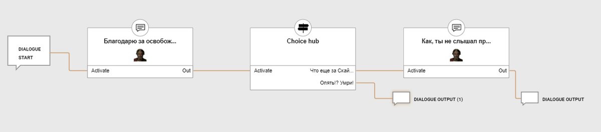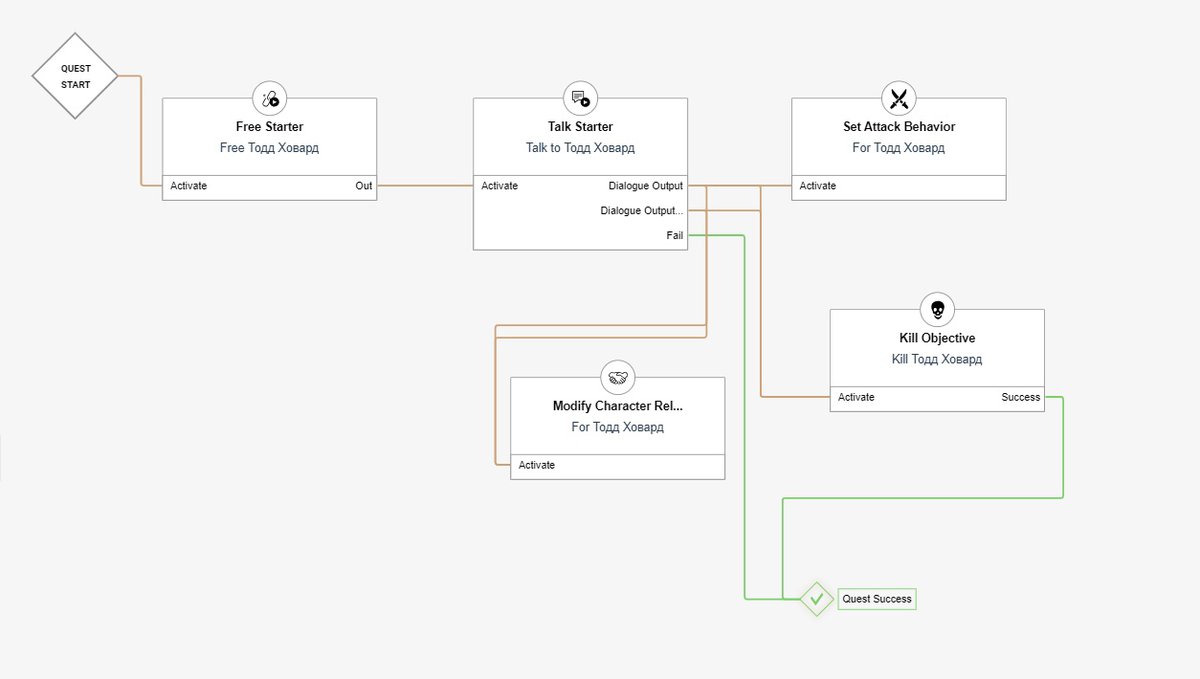 В зависимости от варианта ответа либо Тодд Ховард атакует нашего героя, либо наш герой получит задание убить Тодда Ховарда. Обратите внимание на первую схему: изначально Тодд настроен по отношению к протагонисту дружественно, чтобы это изменить, мы вешаем на ветку диалога соответствующий модификатор.