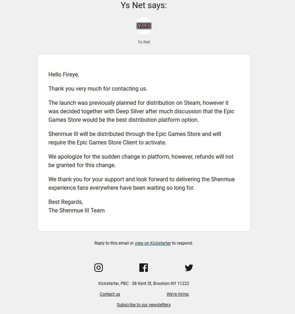 На вчерашнем PC Gaming Show сообщили, что YS Net заключили соглашение с Epic Games Store: Shenmue 3 станет эксклюзивом этой площадки и не появится в Steam. Некоторые участники краудфандинговой кампании посчитали поведение разработчиков непорядочным и попросили вернуть деньги. Им было отказано.