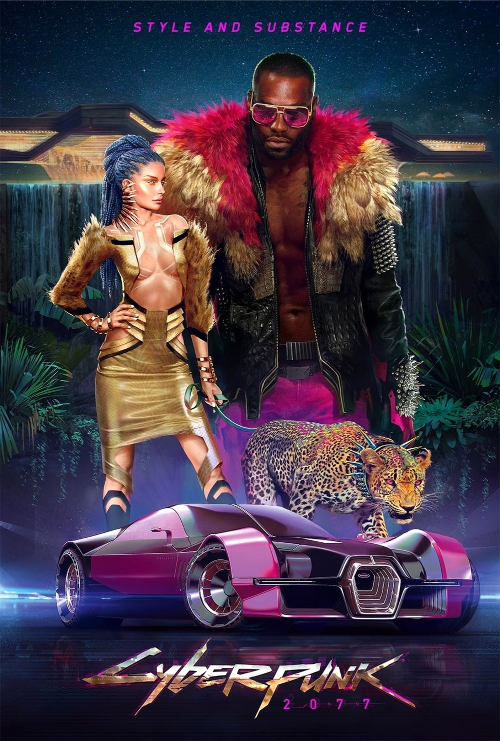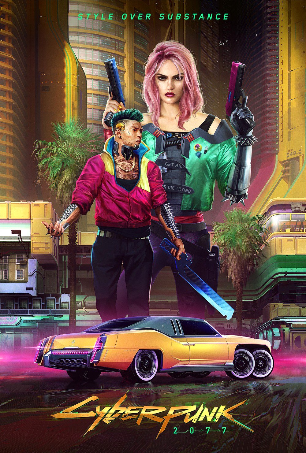 Похоже, что на арты попали представители нескольких групп, населяющих Найт-Сити. Первая работа это явно корпоративные работники: модная одежда, технологичное оружие, красивая, но строгая машина. И небоскребы на фоне.