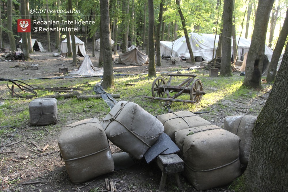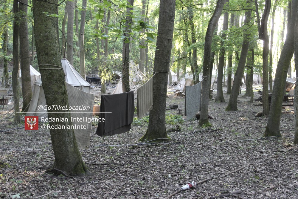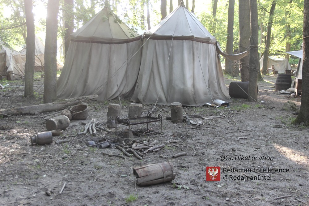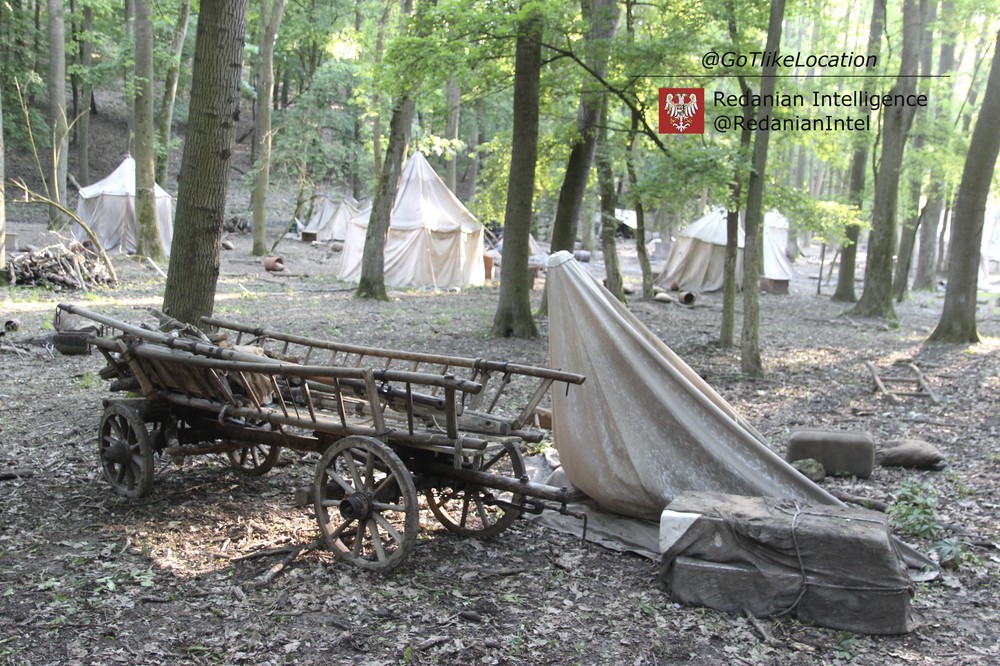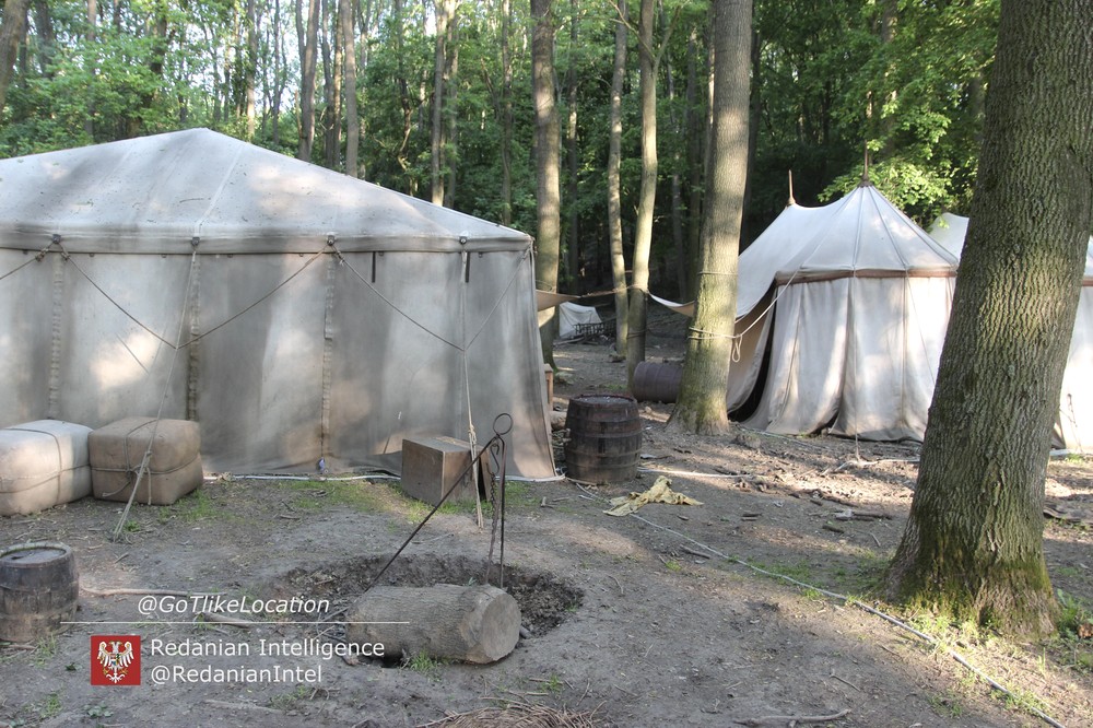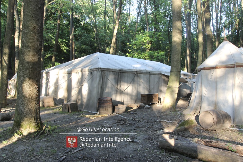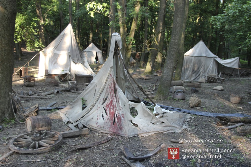 Лагерь получился достаточно аутентичным. В лесу стоят палатки, окруженные телегами с деревом; пара палаток сгорела — то ли по воле сценаристов, то ли случайно. Рядом, кстати, расставлены огнетушители.