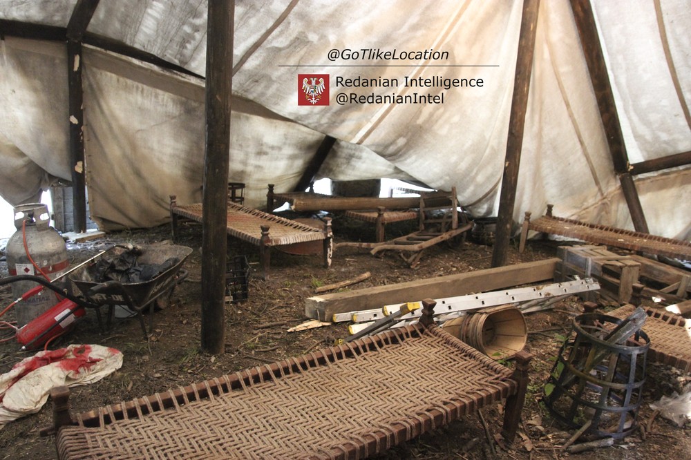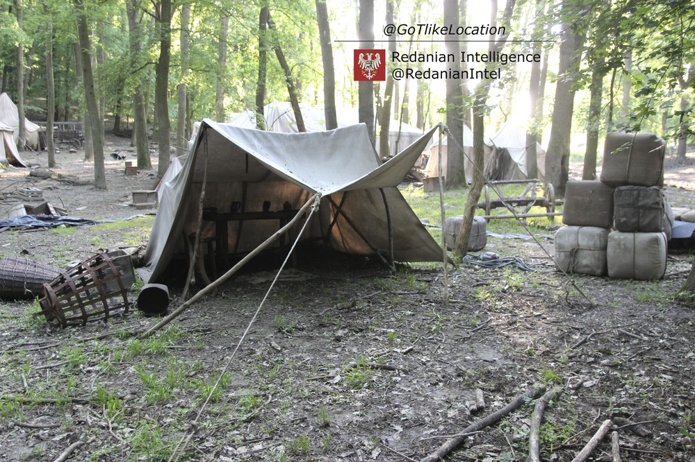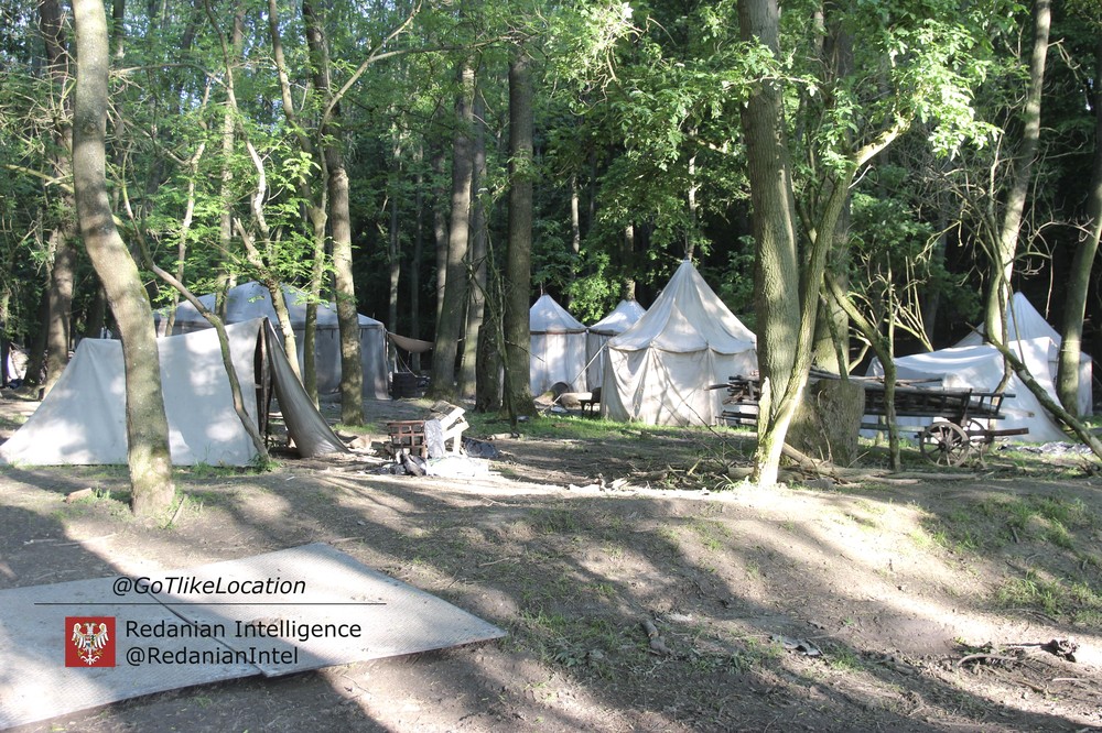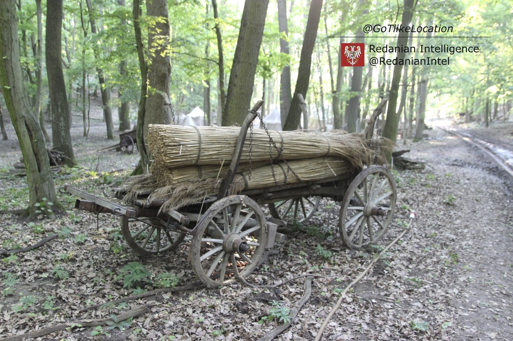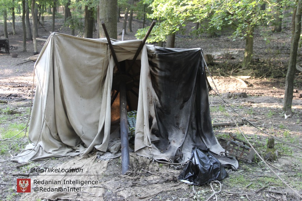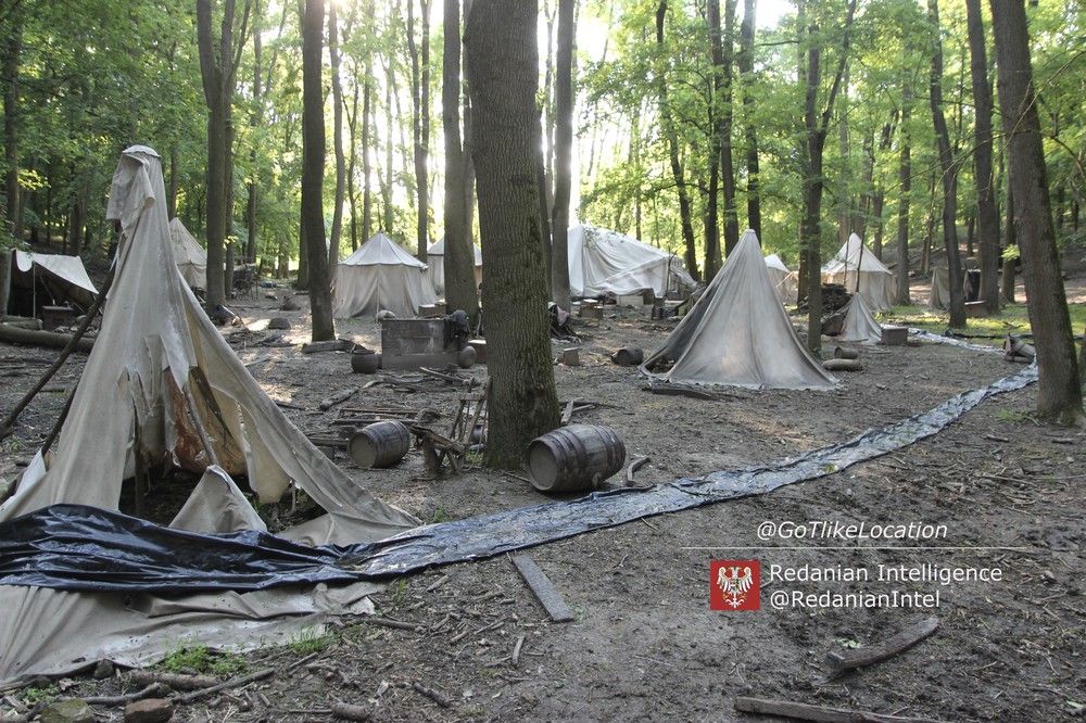 Лагерь получился достаточно аутентичным. В лесу стоят палатки, окруженные телегами с деревом; пара палаток сгорела — то ли по воле сценаристов, то ли случайно. Рядом, кстати, расставлены огнетушители.