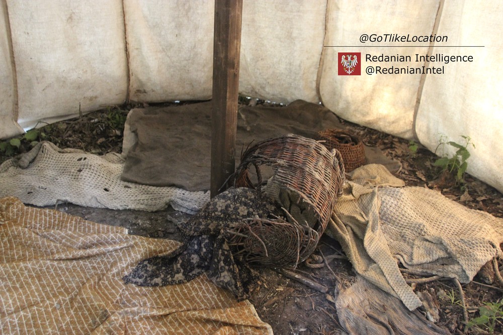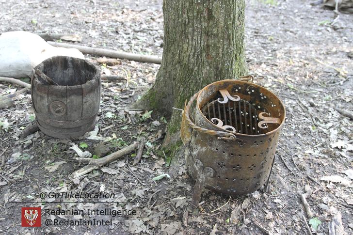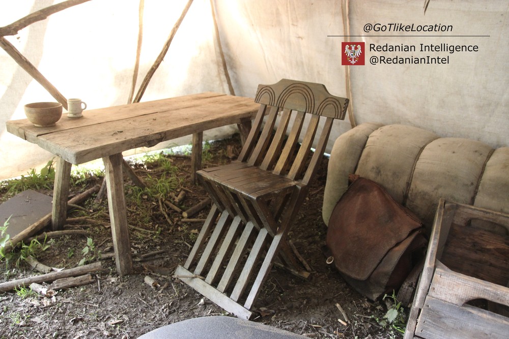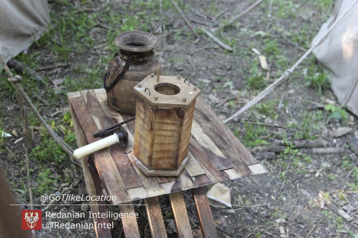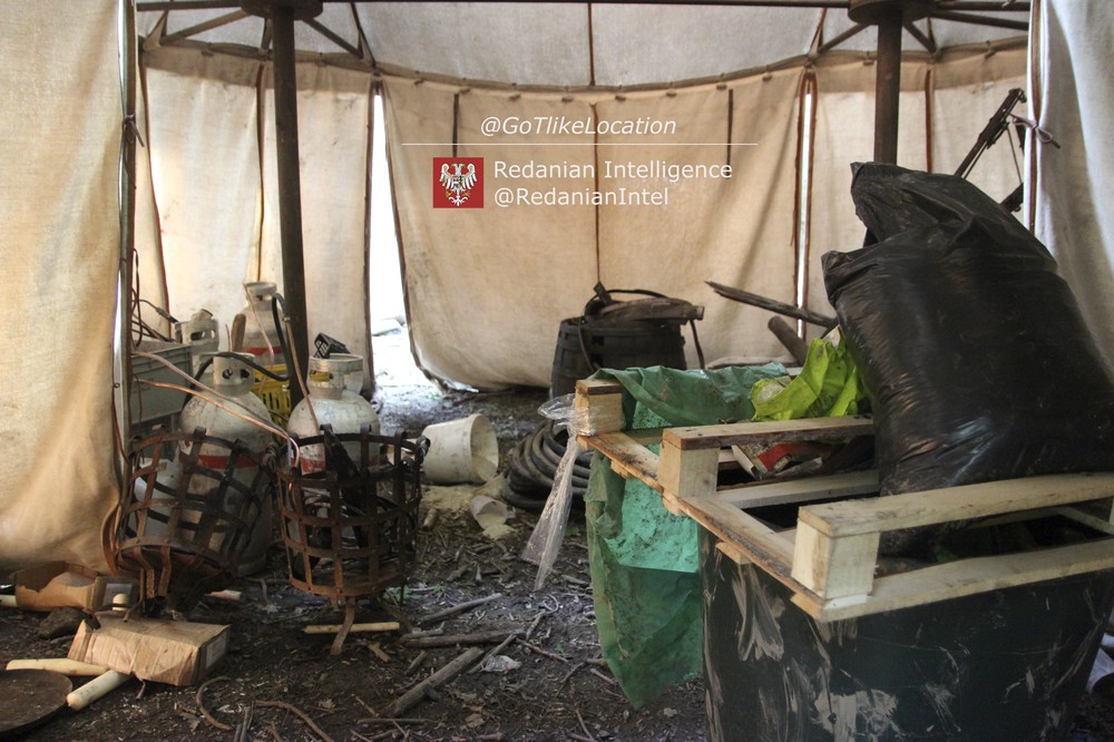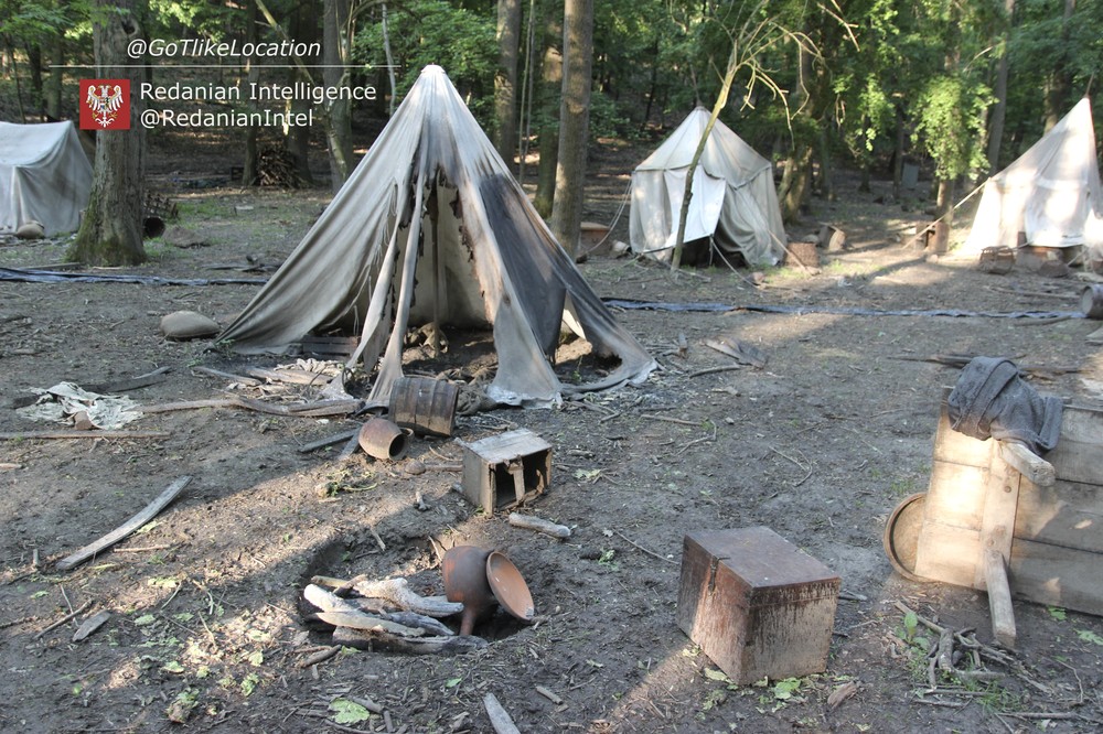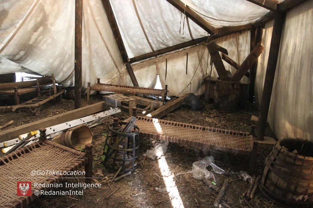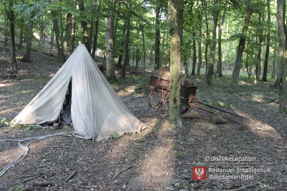 Лагерь получился достаточно аутентичным. В лесу стоят палатки, окруженные телегами с деревом; пара палаток сгорела — то ли по воле сценаристов, то ли случайно. Рядом, кстати, расставлены огнетушители.