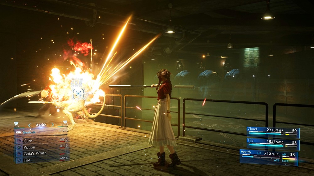 Вместе с мирными сценами разработчики показали несколько сражений: Клауд размахивает своим гигантским клинком, уничтожая противников в метро, а Аэрис призывает свою магию где-то на городских улицах.