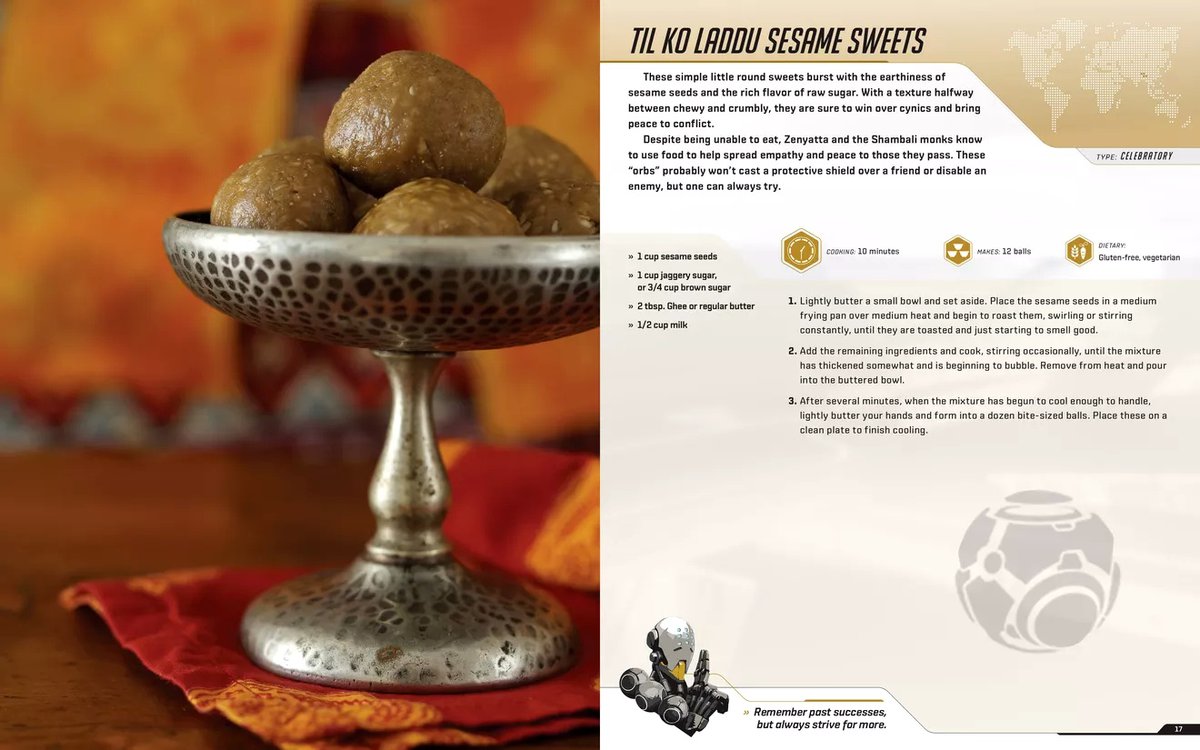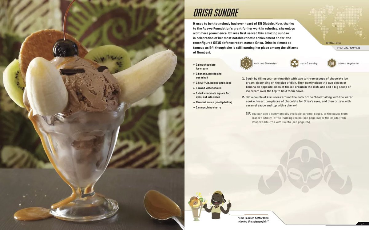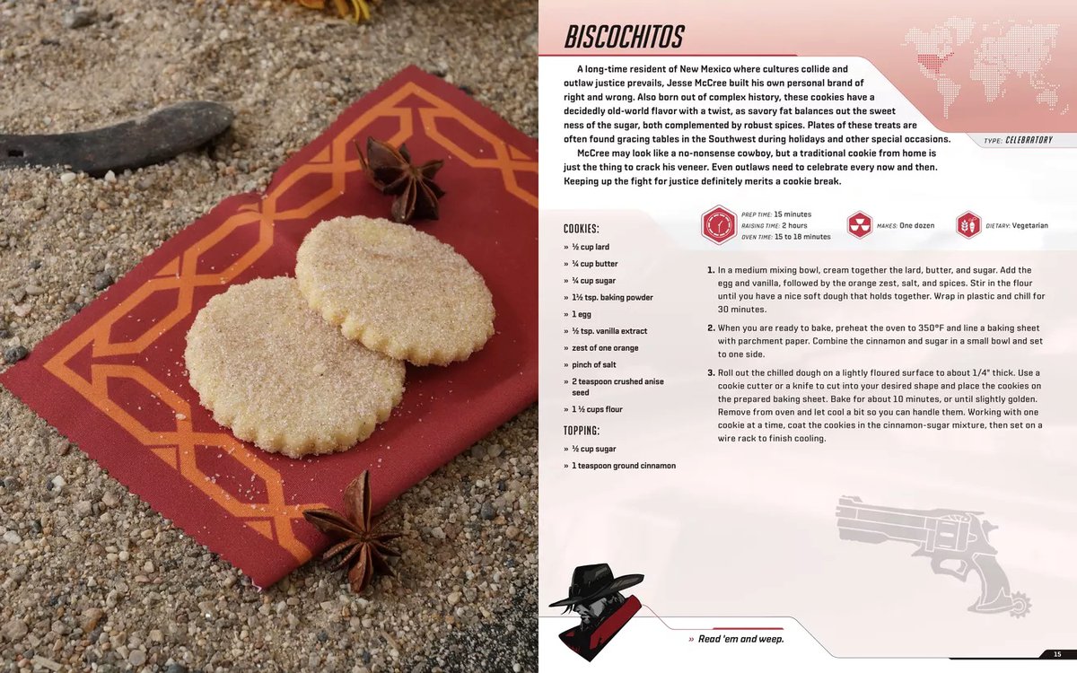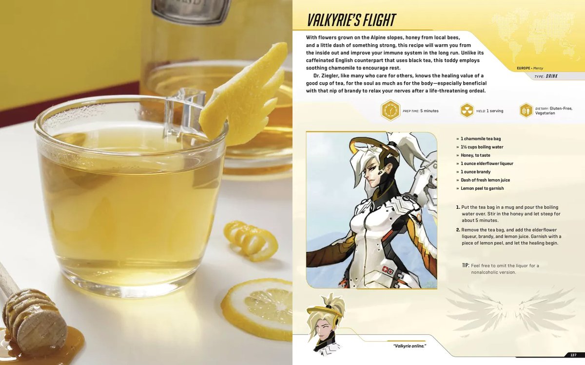 При отборе рецептов для адаптации Монро-Кассель обращала внимание на национальные блюда стран героев Overwatch. Так в поваренной книге появился «Полет валькирии» от Ангела — на самом деле это горячий пунш, популярный в Альпах.