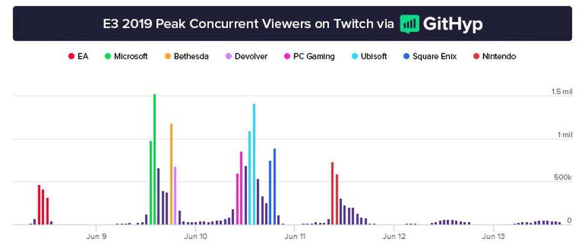 Аналитический сервис GitHyp выпустил отчет по итогам трансляций с выставки E3 на Twitch. Презентацией, привлекшей наибольшее зрительское внимание, стала пресс-конференция Microsoft: ее смотрели более 1.5 миллионов зрителей.