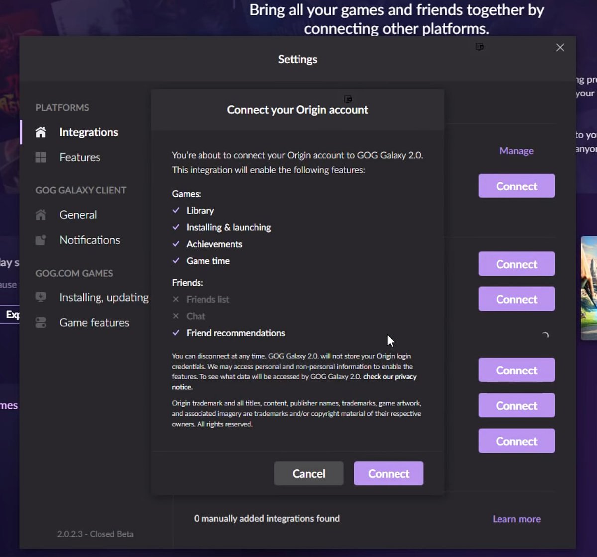 Например, интеграция с Origin позволяет добавить в библиотеку GOG Galaxy игры и достижения, клиент получат доступ к рекомендациям друзей и времени, проведенном в играм. Доступа к списку друзей и чату с ними не будет.