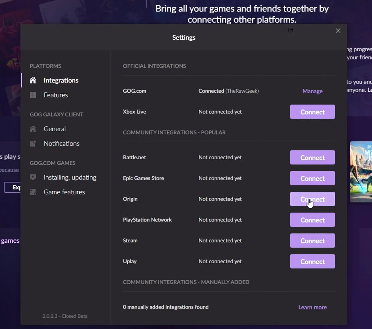 У GOG Galaxy 2.0 есть два типа интеграций со сторонними сервисами: официальные, поддерживаемые самими создателями сервиса, и пользовательские; в теории создать собственную интеграцию может кто угодно. Сейчас официальных интеграций только две: с самим GOG и Xbox Live.