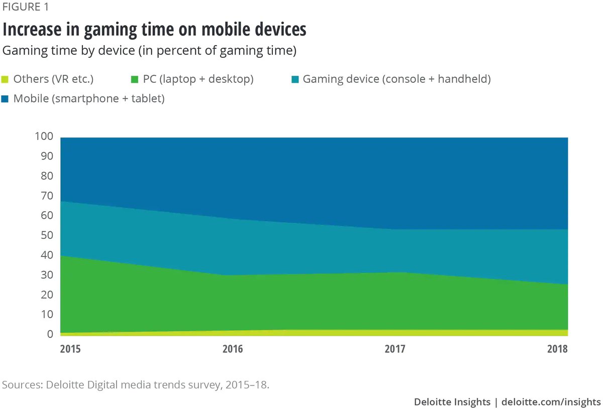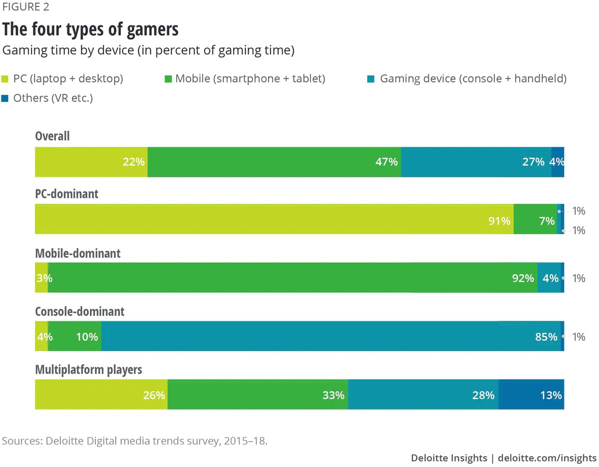 Аналитики компании видят четкий тренд на переход от традиционных игровых платформ — например, PC — к мобильным устройствам. Если в 2015 году на PC хотя бы изредка играли 77% игроков, то к 2018 году этот показатель уменьшился до 48%.