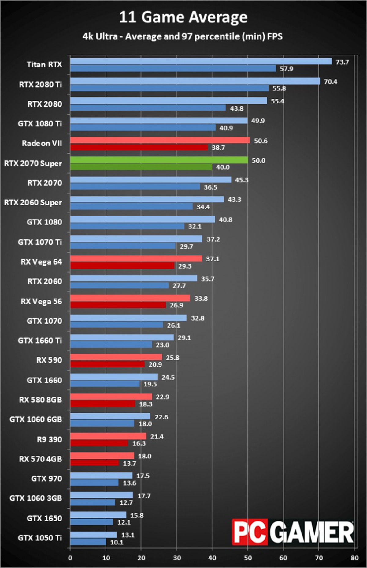Сейчас у AMD есть только одна видеокарта, показывающая результаты, сопоставимые с GeForce RTX 2070 Super — это Radeon VII. Обе карты выдают практически идентичные показатели, с увеличением разрешения Radeon VII незначительно обгоняет конкурента.