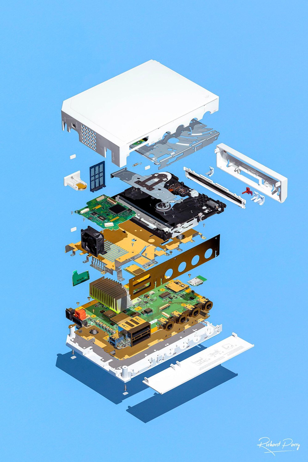 Слои деталей выкладываются на прозрачном листе акрила; все сажается на клей и получается картина «внутреннего мира» устройства, парящая в воздухе. Затем следует этап пост-обработки. С готовой фотографии Парри убирает следы клея и легкое размытие, появляющееся из-за наложения акриловых листов.