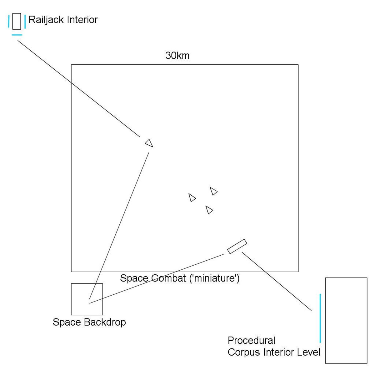 Для реализации космических битв разработчики использовали технологию порталов. В реальной локации Empyrean площадью 32 квадратных километра летают корабли-болванки: внутри них нет ни интерьеров, ни игроков, вообще ничего. По масштабам они тоже меньше тех кораблей, что видят игроки.