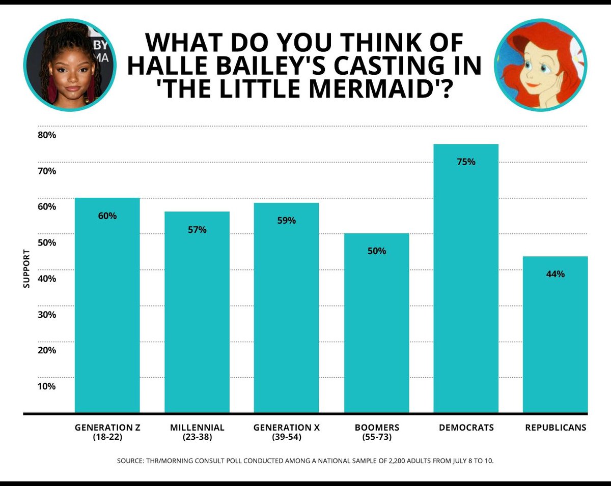 Morning Consult и Hollywood Reporter поинтересовались у 2200 взрослых американцев их мнением по поводу кастинга «Русалочки» в экранизации Disney. На главную роль в фильме взяли темнокожую актрису и певицу Холли Бэйли, это решение активно обсуждалось и критиковалось в социальных сетях.