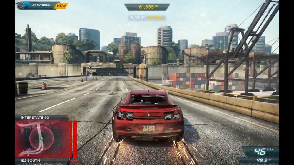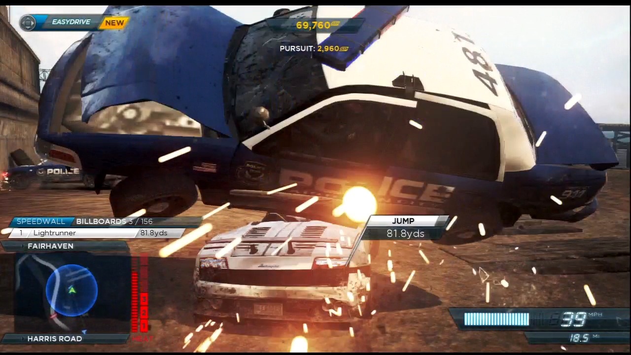 Во-первых, сам HUD был исполнен в более голубых тонах и некоторые его составляющие отличаются местоположением. Однако мне хотелось бы обратить ваше внимание на надпись COST TO STATE. Да, всё верно, раньше во время погони присутствовала механика подсчёта урона штату, прямиком из первой части. В финальной же версии эту идею заменили на простой подсчёт очков.