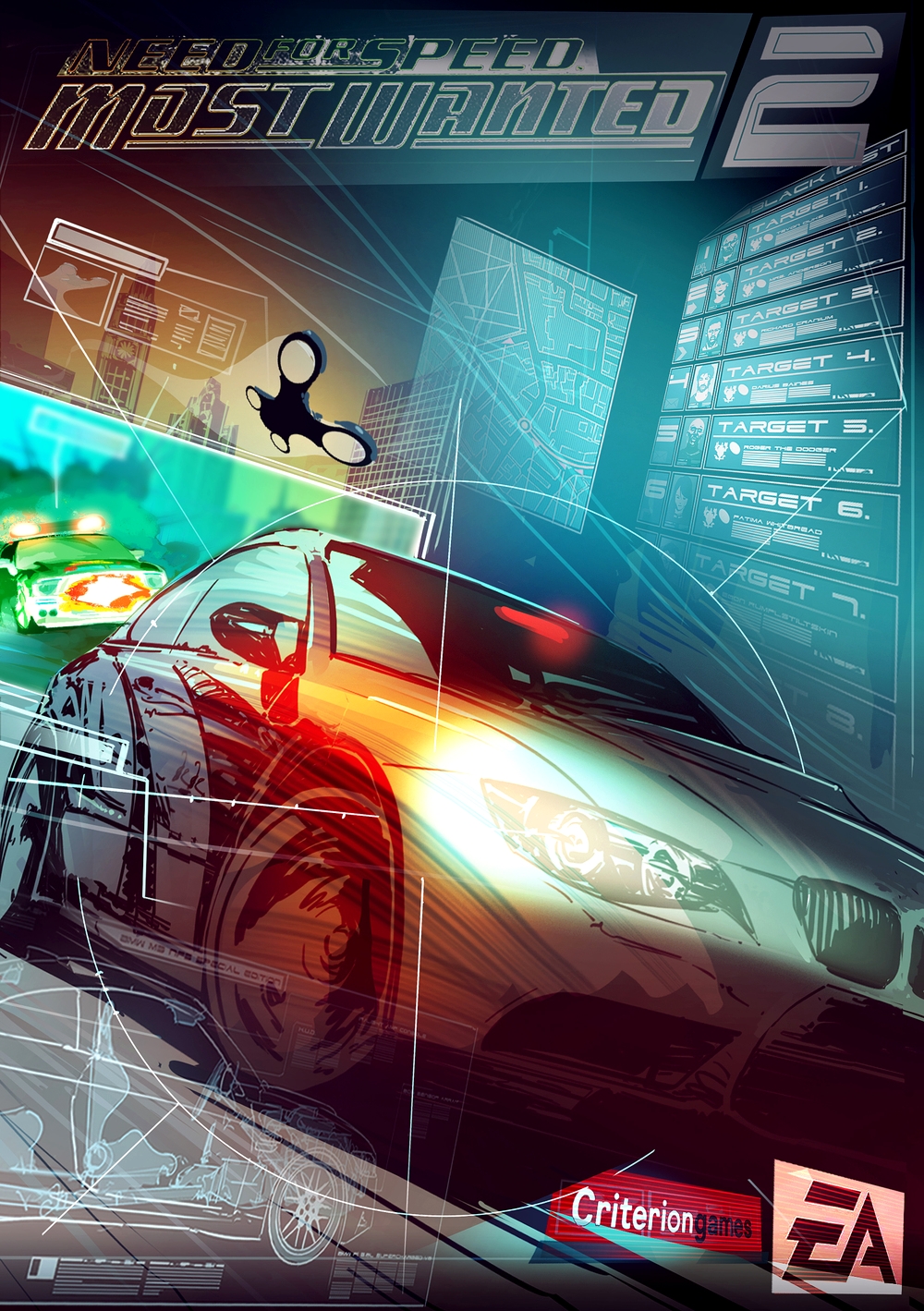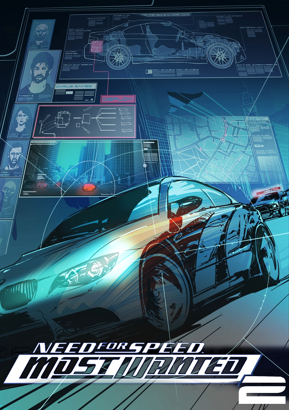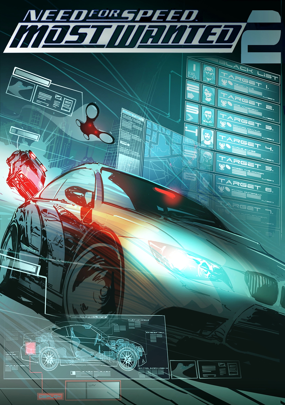 Ну и последнее, пара слов о истории. Вы уже видели скетчи и арты к Most Wanted 2. Один из них изображает BMW с рядом лиц внизу.