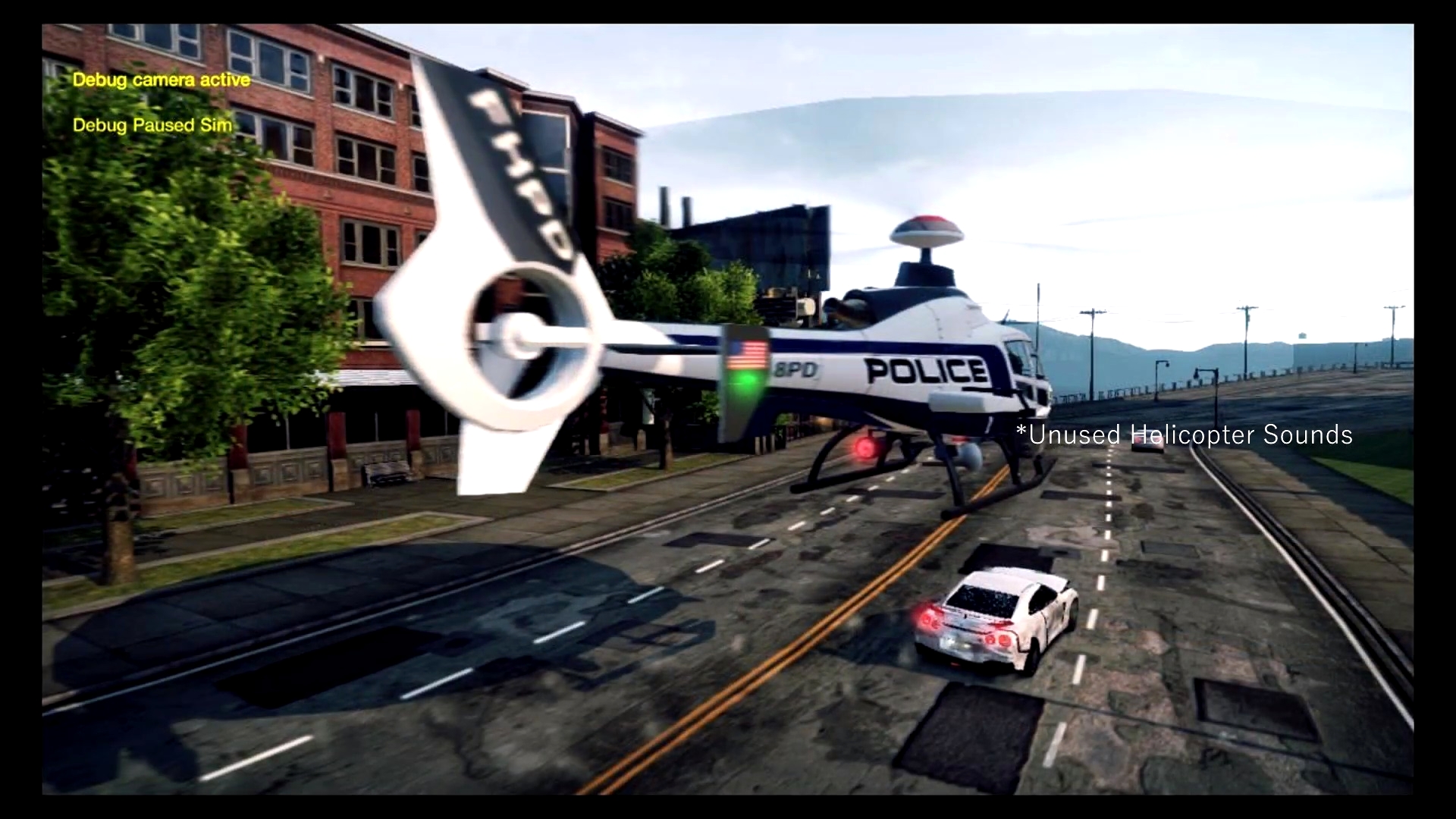 Пресловутый вертолёт, к сожалению, выбросили почти сразу, однако строки о нём и некоторые звуковые файлы всё ещё можно найти внутри игровых архивов. Также, согласно этому источнику, о вертолёте указывали и в некоторых интервью во время разработки (однако лично мне не удалось найти подтверждений). Фанаты даже утверждают что пресловутая вертушка появлялась в каких-то билдах, однако, возможно, была вырезана, в связи со сложностью реализации маршрута полётов в центральной части города среди небоскрёбов и высоких домов.