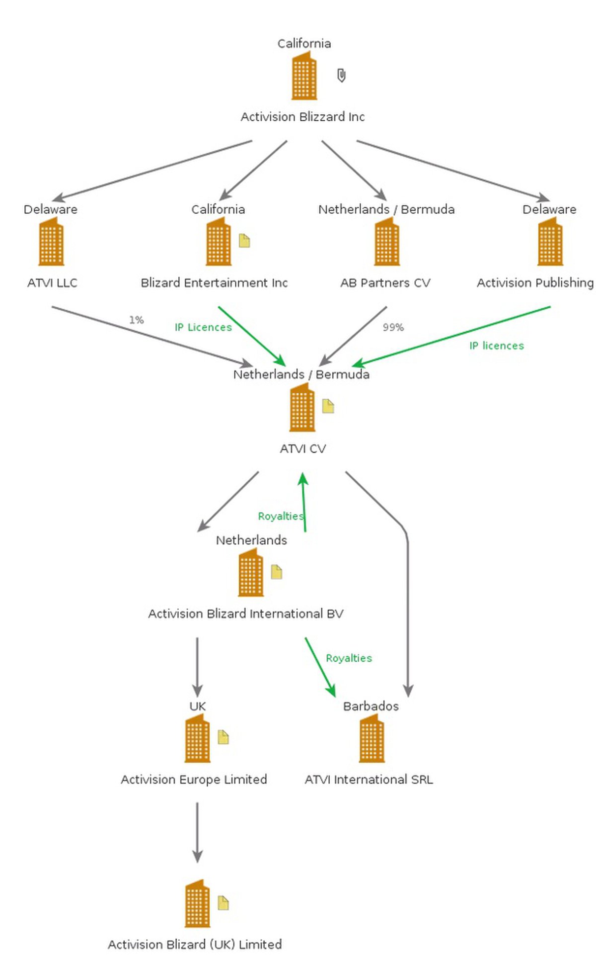 В частности, у Activision Blizzard есть офшоры на Бермудах и Барбадосе: ATVI International SRL и ATVI CV. Эти компании владеют правами на игры холдинга и получают роялти от Activision Blizzard International BV — подразделения, занимающегося дистрибуцией игр Activision Blizzard за пределами США.