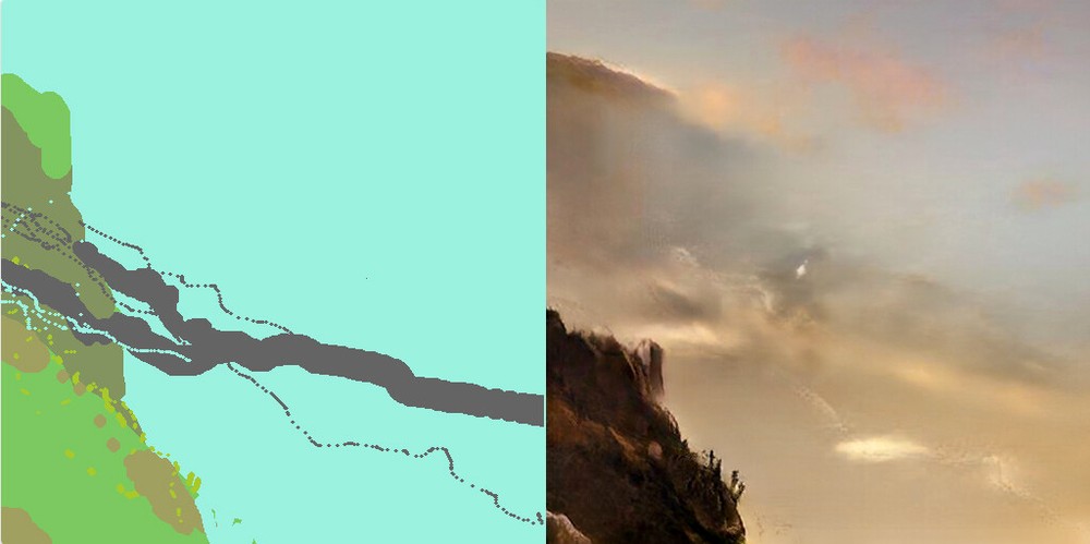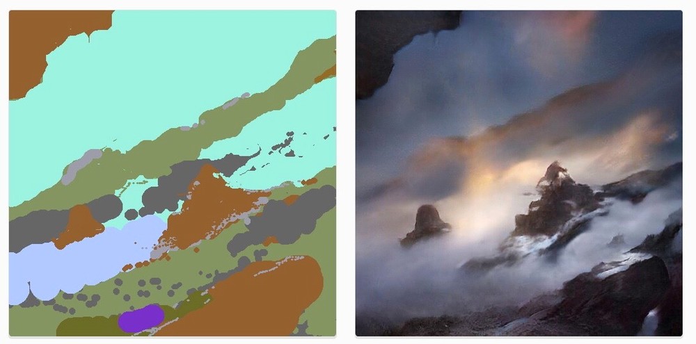 Вот так выглядели исходные материалы для рисунка. Слева — набросок, сделанный Верцем для GauGAN (разные цвета обозначают разные типы объектов), а справа финальное изображение фона, сгенерированное ИИ на основе наброска художника.