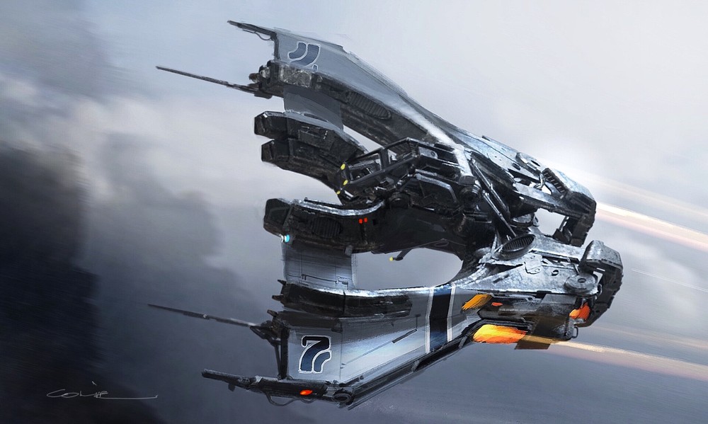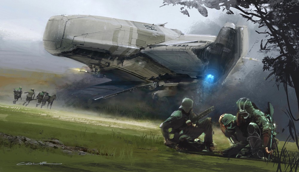 На изображении выше показан один из концептов Коли, арт ниже — рендер, созданный GauGAN на базе простого наброска художника. В этом случае Верц прорисовал десантный корабль, добавил бойцов и поработал с фонами.