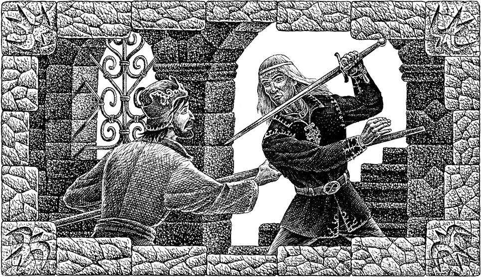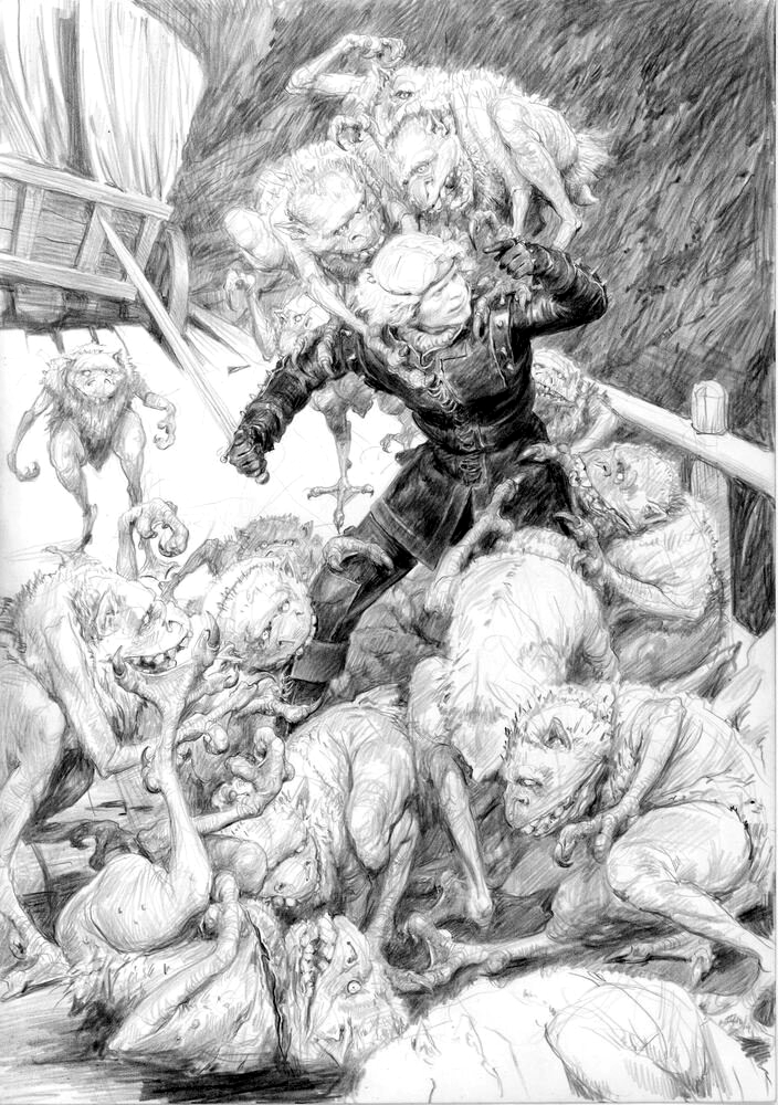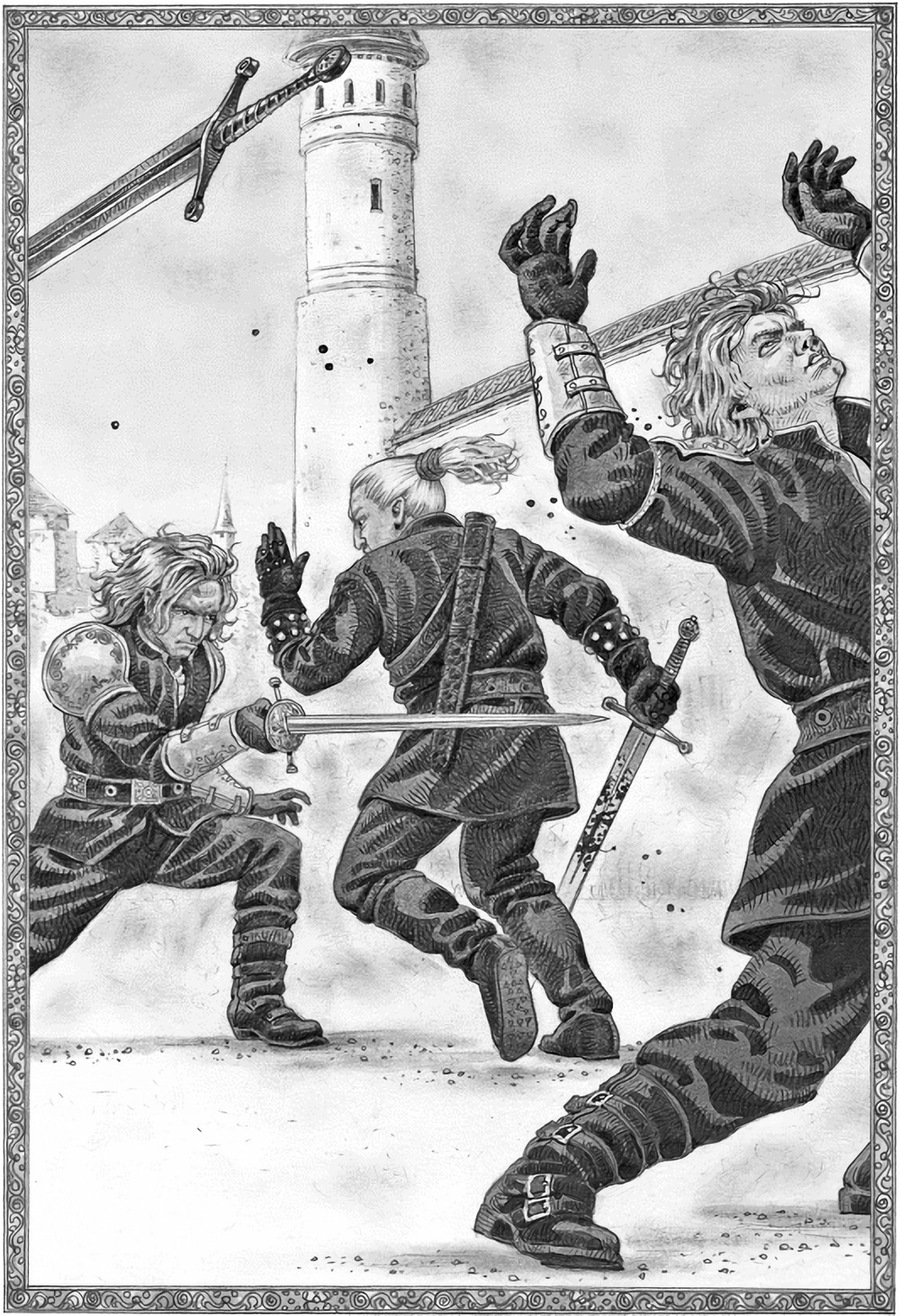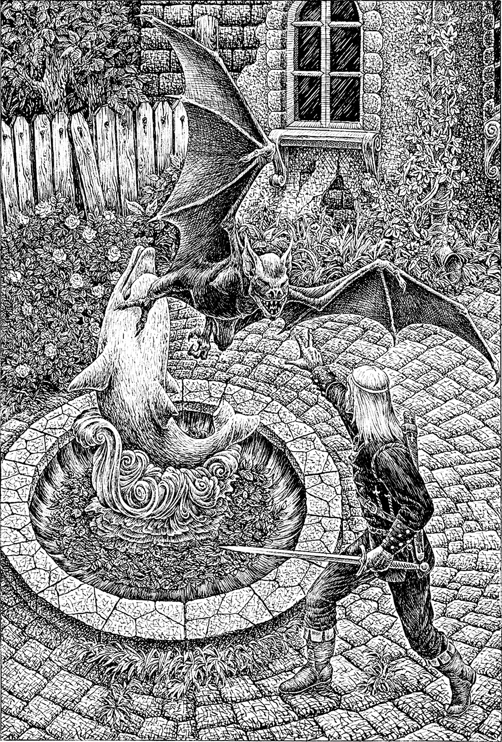 Ниже мы собрали еще несколько работ Михаила Новикова и Александра Продана из иллюстраций к различным книгам о Геральте. Попробуете опознать сцены, которые изобразили художники? Подсказка: на первом арте Михаила Геральт сражается с Вильгефорцем из Роггевеена.