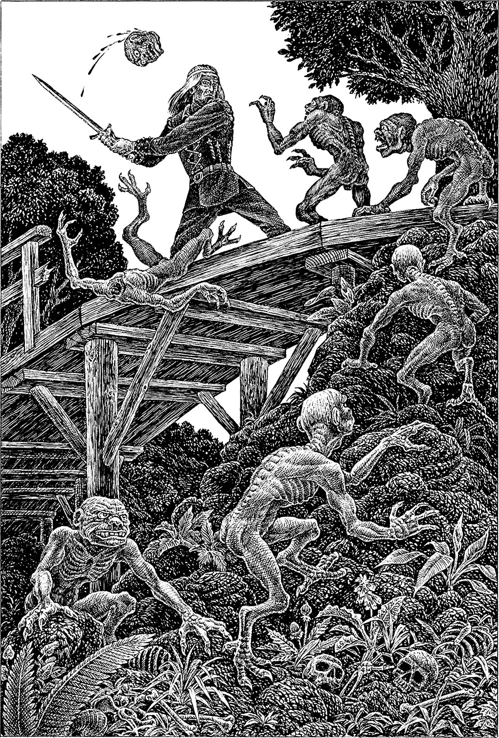 Среди работ художников есть несколько артов, изображающих одни и те же сцены из книг — это позволяет понять, как по-разному они относятся к исходному материалу. Вот, например, драка Геральта с обитателями оврага у моста; первый кадр это работа Михаила Новикова, второй — Дениса Гордеева.