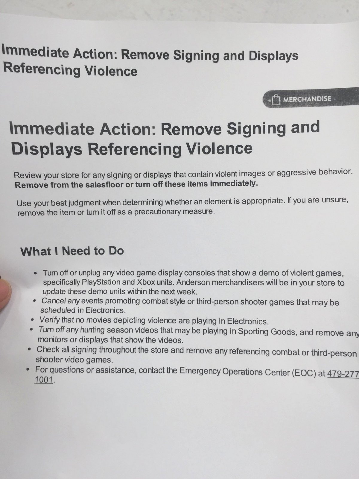 Сотрудники американской сети Walmart, крупнейшего ритейлера в мире, начали выкладывать в социальных сетях фотографии распоряжений, предписывающих удалить из магазинов все намеки на насилие или агрессию. В распоряжении особо прописаны видеоигры.