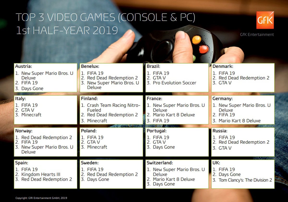Из игр, выпущенных в 2019 году, в топы попали Super Mario Bros. U Deluxe (она смогла четыре раза занять верхнюю строчку), Kingdom Hearts 3, The Division 2 и Days Gone. При оценке продаж аналитики GfK использовали данные только о реализации игр на физических носителях.